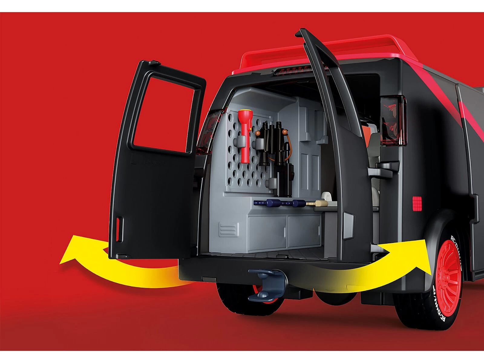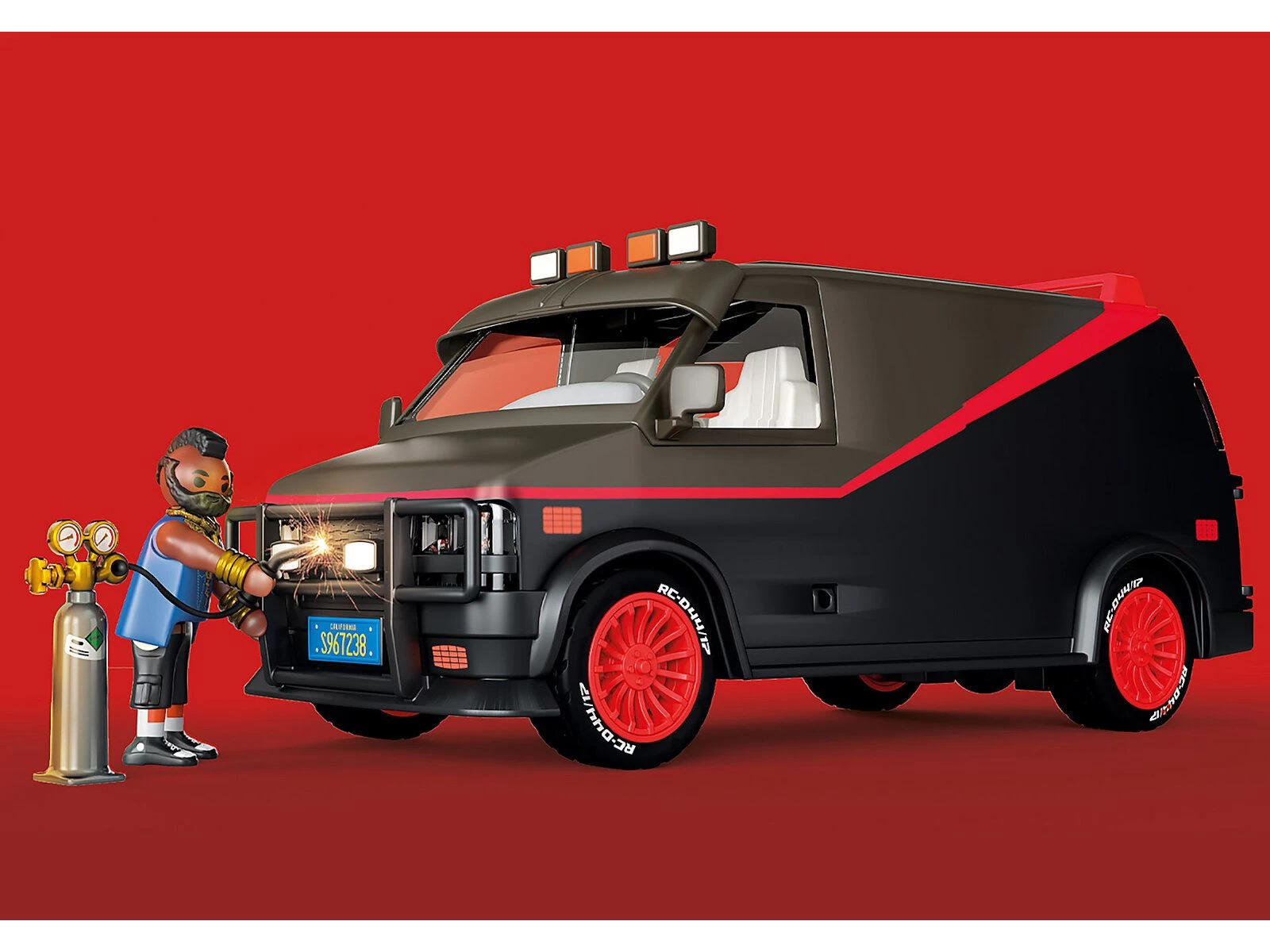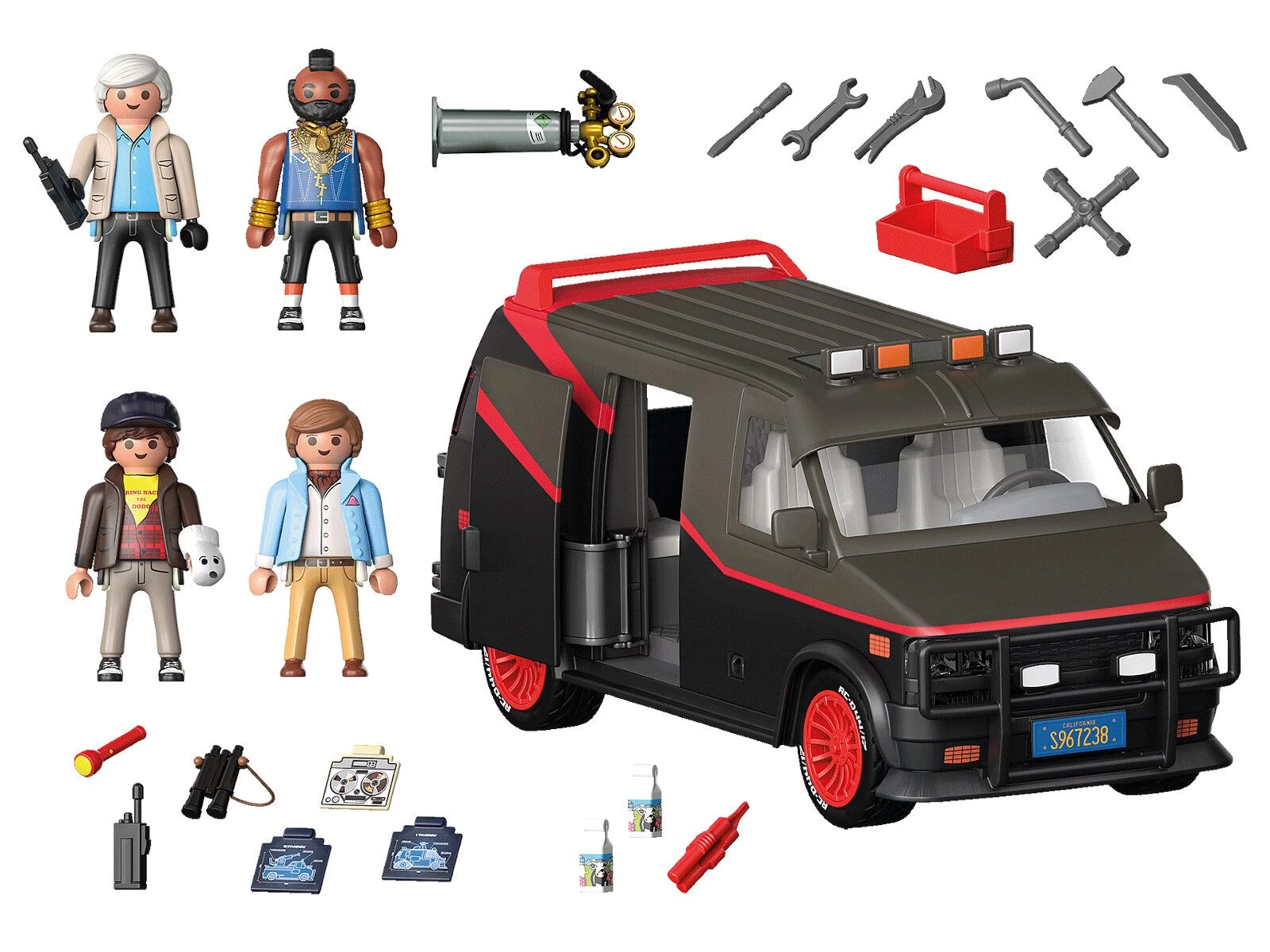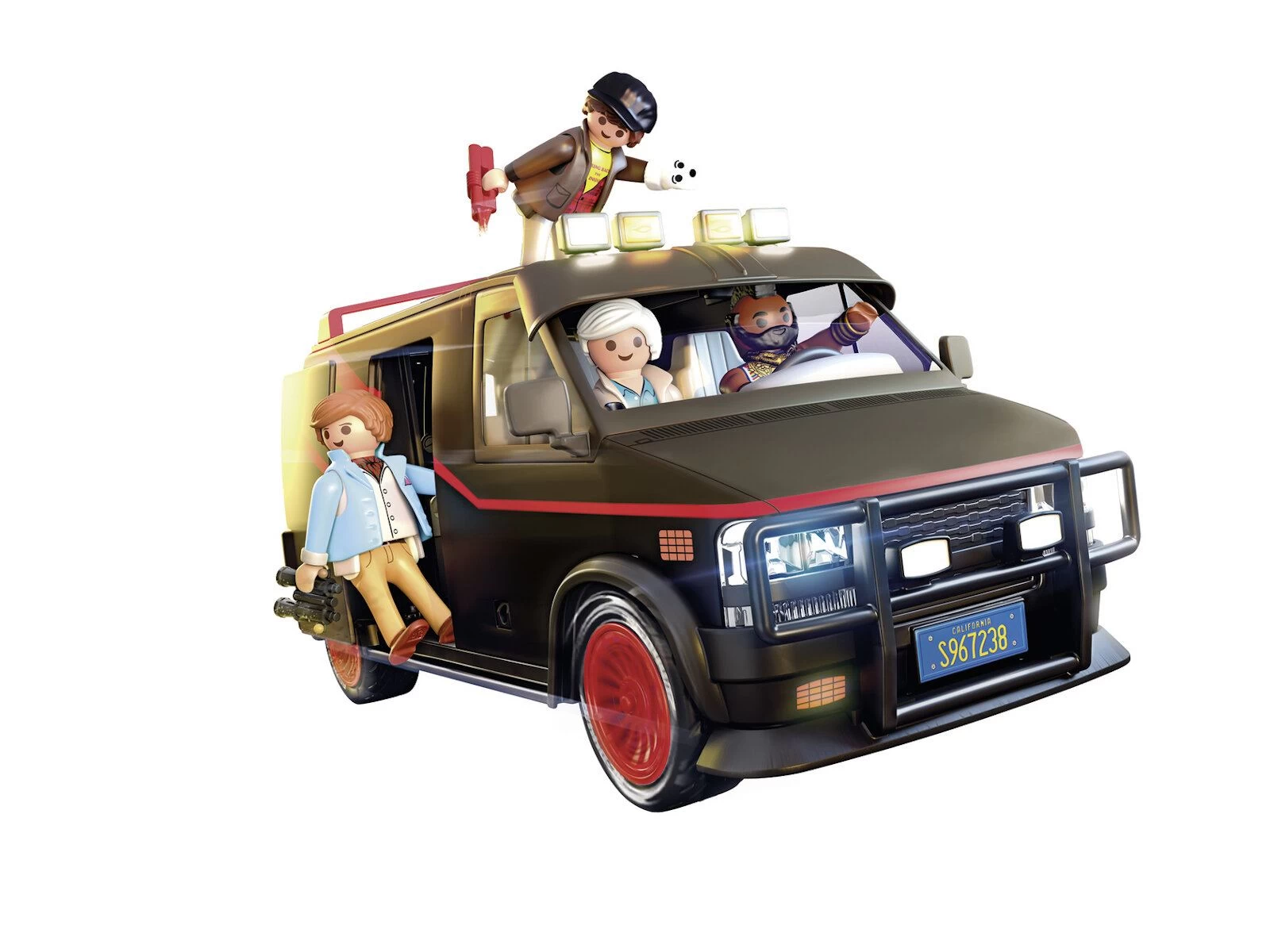 El Equipo A son cuatro ex soldados de élite en una misión inusual. Enviados a prisión por un tribunal militar por un crimen que no cometieron, se escaparon y ahora ayudan a otros que lo necesitan. Si tienes un problema, si nadie más puede ayudarte, y si puedes encontrarlos, puedes contratar al Equipo A. Además de Hannibal, B.A., Face y Murdock, el quinto miembro del equipo es, sin duda, la furgoneta del Equipo A. Con su amplio equipamiento interior con monitor, máquina de soldar, tableros de operaciones, armario y pared perforada para diversos accesorios, la furgoneta está bien equipada para cualquier operación especial. Por supuesto, todos los miembros del equipo encuentran espacio dentro de la furgoneta. El techo se puede quitar para facilitar el juego. Al igual que el original, la furgoneta del Equipo A de PLAYMOBIL también tiene la icónica pintura en tres colores, un parasol extendido y llantas rojas. Una atracción no sólo para los coleccionistas de coches de la pelÃcula y los fans del Equipo A, sino también para los fans de PLAYMOBIL. El set incluye a Hannibal, B.A., Face y Murdock, asà como una furgoneta con espacio para cinco figuras. La puerta lateral y el portón trasero de la furgoneta se pueden abrir.