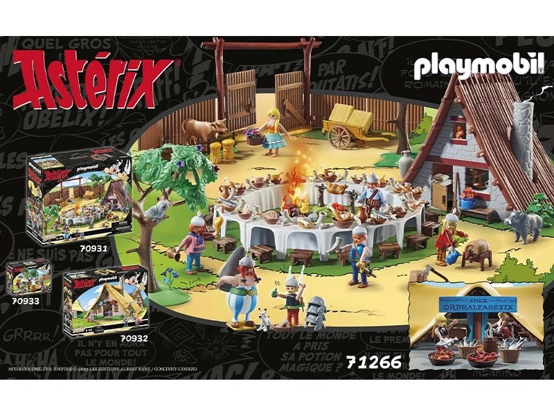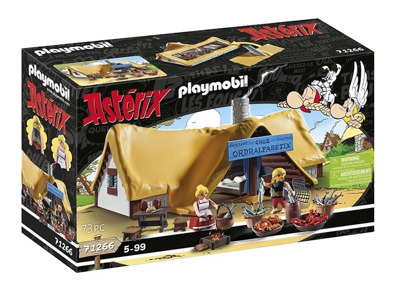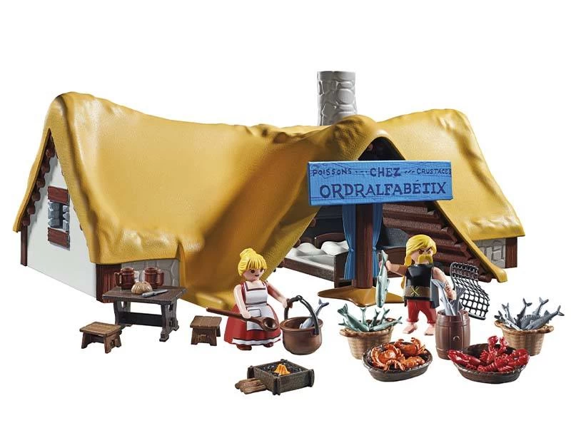 El set de juguetes de Astérix de 73 piezas incluye 2 figuras PLAYMOBIL del pescadero Ordenalfabetix y su esposa, la cabaña, dos camas, mesa, taburete, chimenea, cestas, pescado y marisco a la venta y otros muebles. El techo de la cabaña se puede abrir parcialmente para jugar.