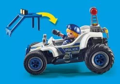 Acaba de ocurrir un robo: Un ladrón ha robado un valioso tesoro del museo. Ahora el ladrón está huyendo con su moto. De repente deja la carretera y se adentra en el bosque. Pero el terreno montañoso e intransitable no es problema para el valiente policía en su todoterreno. Sin esfuerzo, supera todos los obstáculos y sorprende al ladrón mientras intenta esconder los bienes robados en un tronco de árbol hueco. El set contiene dos figuras de PLAYMOBIL, una moto, un coche todoterreno de la policía, un árbol hueco, monedas de oro, pistolas y muchos otros extras.