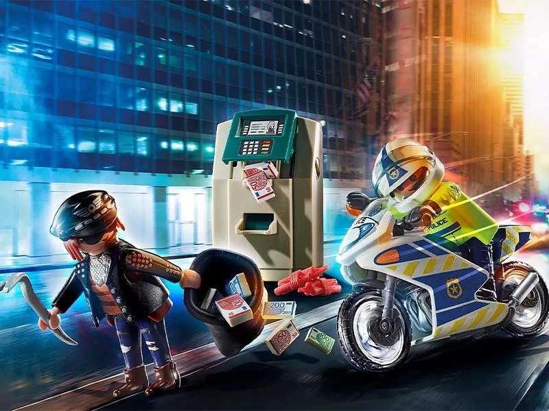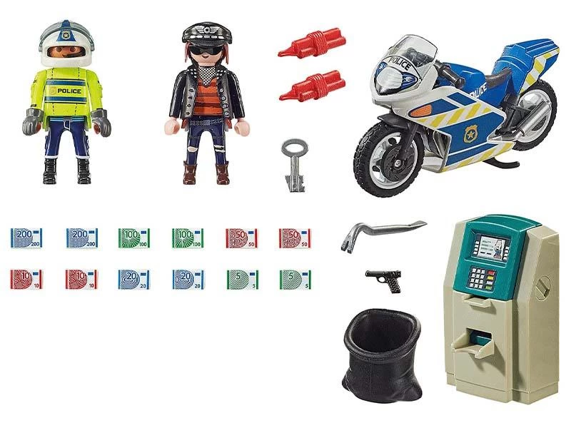Bajo el amparo de la oscuridad, un carterista ha irrumpido en un cajero automático. Pero un rápido oficial de policía ya ha emprendido la persecución con su moto. ¡Este ladrón no llegará lejos! El set contiene dos figuras de PLAYMOBIL, una moto, un cajero automático, una palanca, un saco, billetes y muchos otros extras.