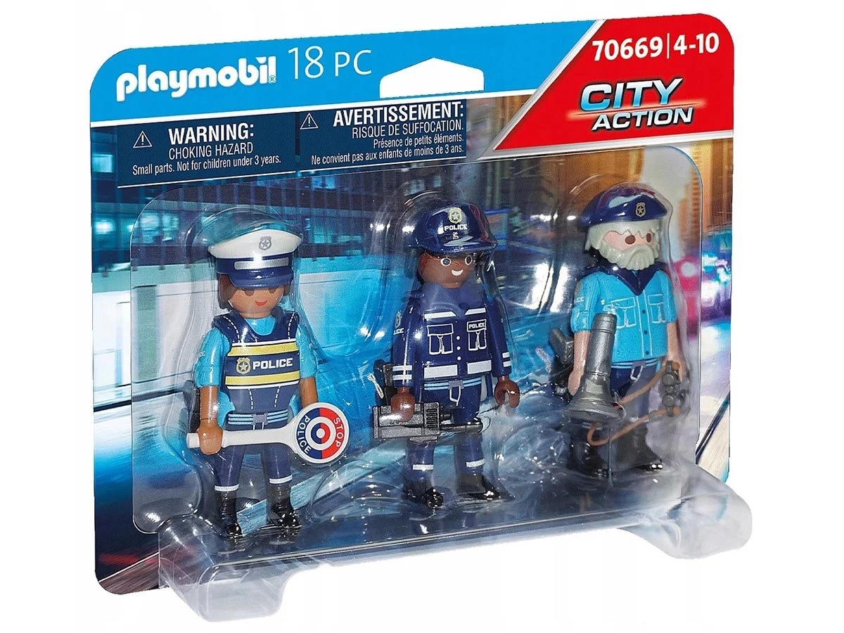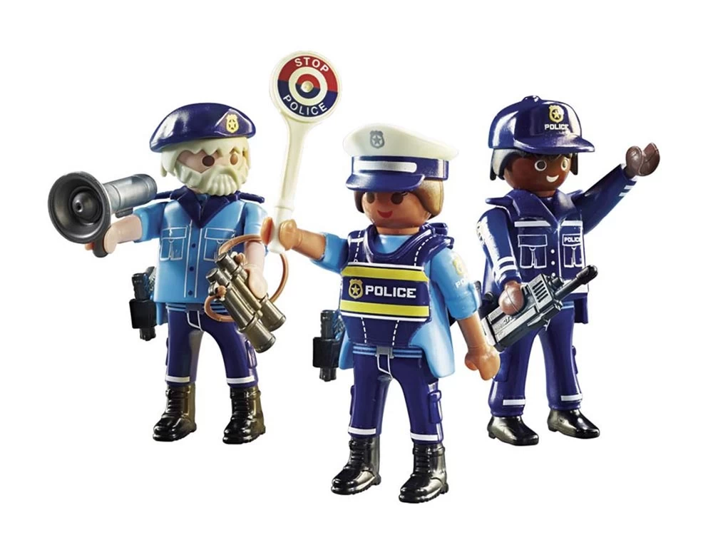 Consigue refuerzos para el equipo de policía de PLAYMOBIL con el set de figuras policía. Tres figuras adicionales equipadas con megáfono, paleta, radio y otros extras te están esperando.