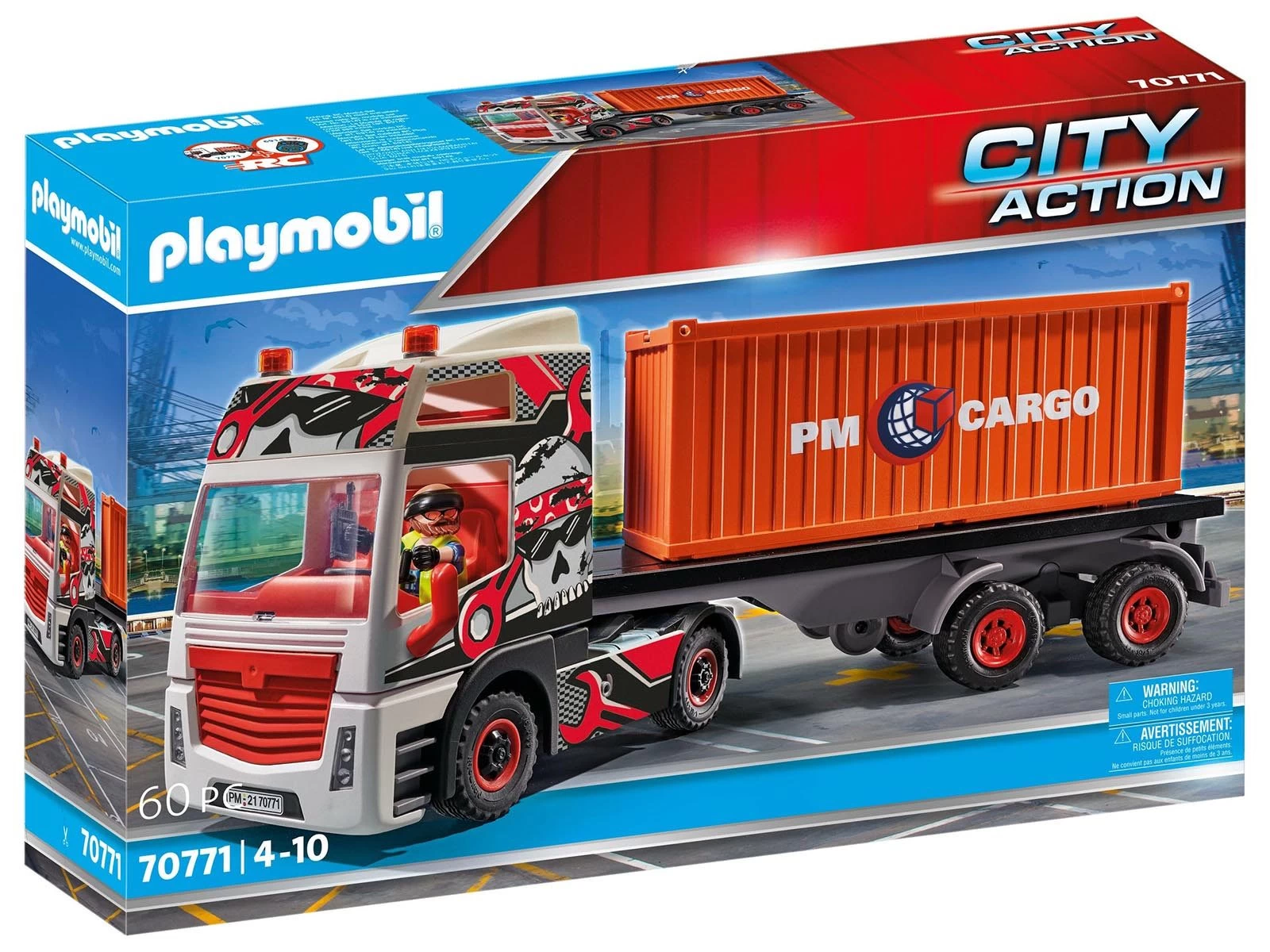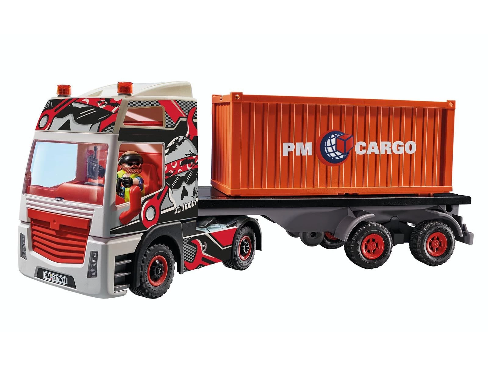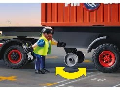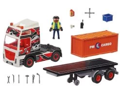 Las rutas de carga en tierra se cubren con el vers谩til cami贸n con remolque. Este cami贸n no s贸lo es robusto y pr谩ctico, sino que tambi茅n tiene un aspecto estupendo con su genial motivo de calavera en la cabina del conductor. Tan pronto como el siguiente buque portacontenedores llega al puerto, el conductor hace avanzar el cami贸n. En un abrir y cerrar de ojos, los pesados contenedores se cargan en la gran zona de carga y el viaje contin煤a. No hay tiempo que perder, 隆ya se espera con impaciencia la entrega! El set de juego consta de una figura PLAYMOBIL, un cami贸n con remolque, radio, caja de herramientas, botella de aceite y muchos otros extras. El cami贸n se puede mejorar con un mando RC (no incluido).