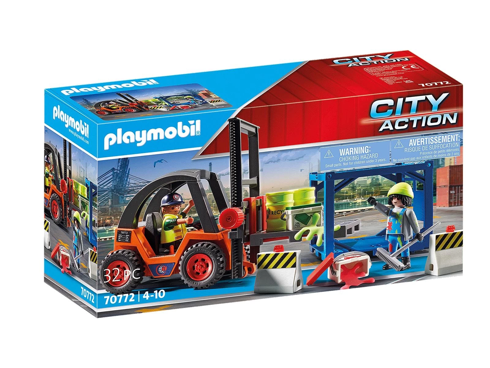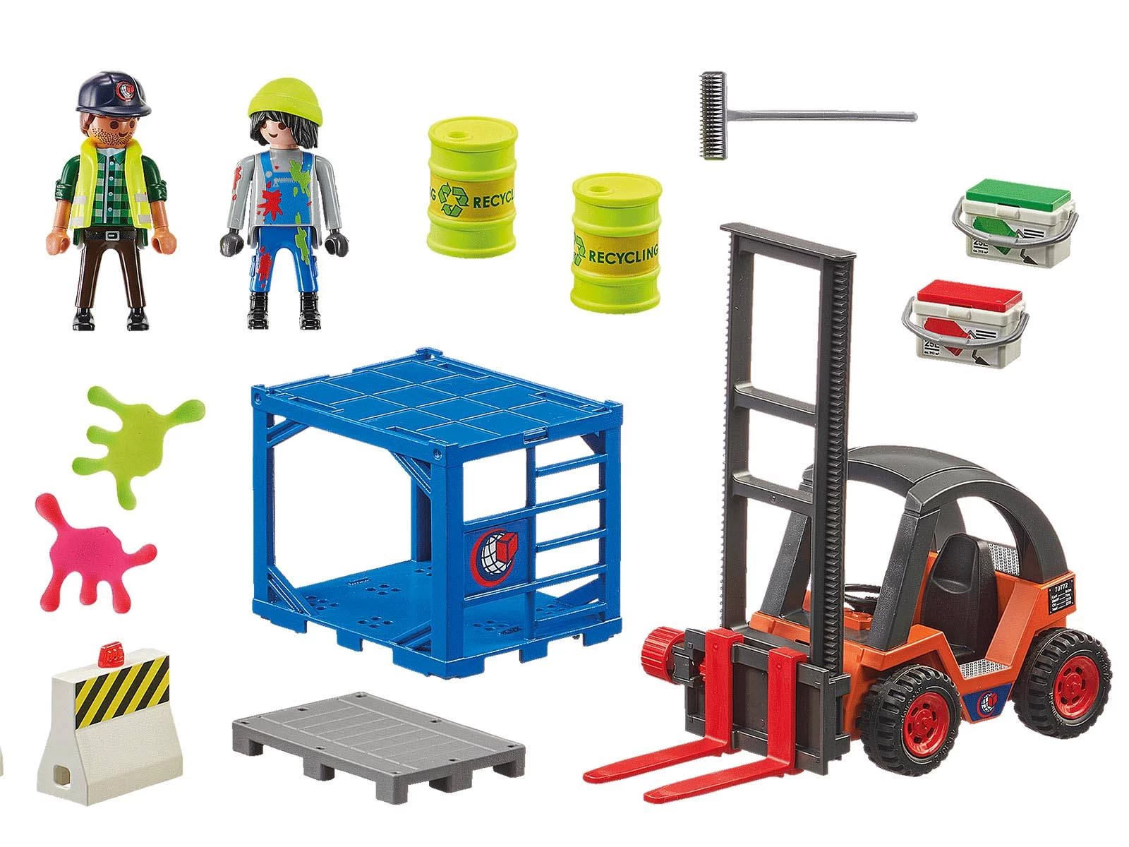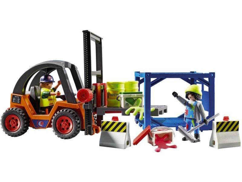 Para cargar los palés y la carga más pequeña, los estibadores utilizan la carretilla elevadora. El conductor está recogiendo un palé con cubos de pintura para transportarlos al almacén de carga. Con cuidado, coge el palé con las horquillas de elevación y lo sube un poco antes de continuar el viaje. ¿Pero qué ocurre? Al parecer, el carro elevador no estaba bien acoplado, los cubos de pintura empiezan a tambalearse y la pintura se derrama por el suelo. ¡Oh, no! ¡Eso no fue un transporte exitoso! El set de juego contiene dos figuras PLAYMOBIL, una carretilla elevadora, dos cubos de pintura, salpicaduras de pintura, una escoba y muchos otros extras. Las horquillas de la carretilla elevadora se pueden mover lateralmente y así adaptarse a la carga adecuada.