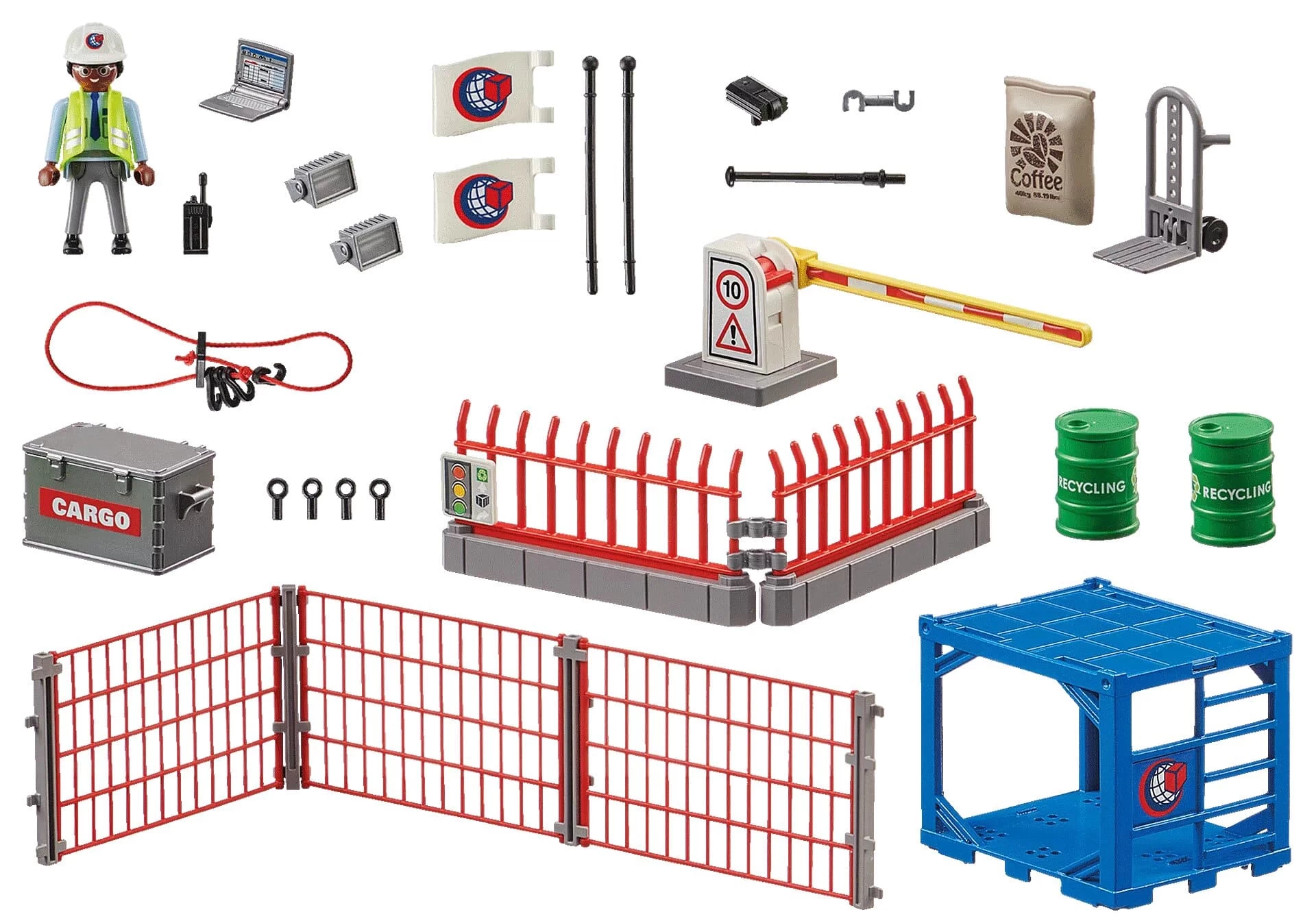 Si el transporte de mercancías no puede continuar inmediatamente, las mercancías se depositan temporalmente en el almacén de mercancías. Ya sean contenedores, bidones o sacos, todo se almacena aquí de forma segura. Acaba de llegar un nuevo contenedor. Tiene que ser almacenado temporalmente durante unos días. Por razones de seguridad, el trabajador del muelle asegura el contenedor a la placa base con una cuerda. Ahora nada puede resbalar. El set de juego incluye una figura PLAYMOBIL, elementos de valla, una barrera, un módulo de contenedor y muchos otros extras.