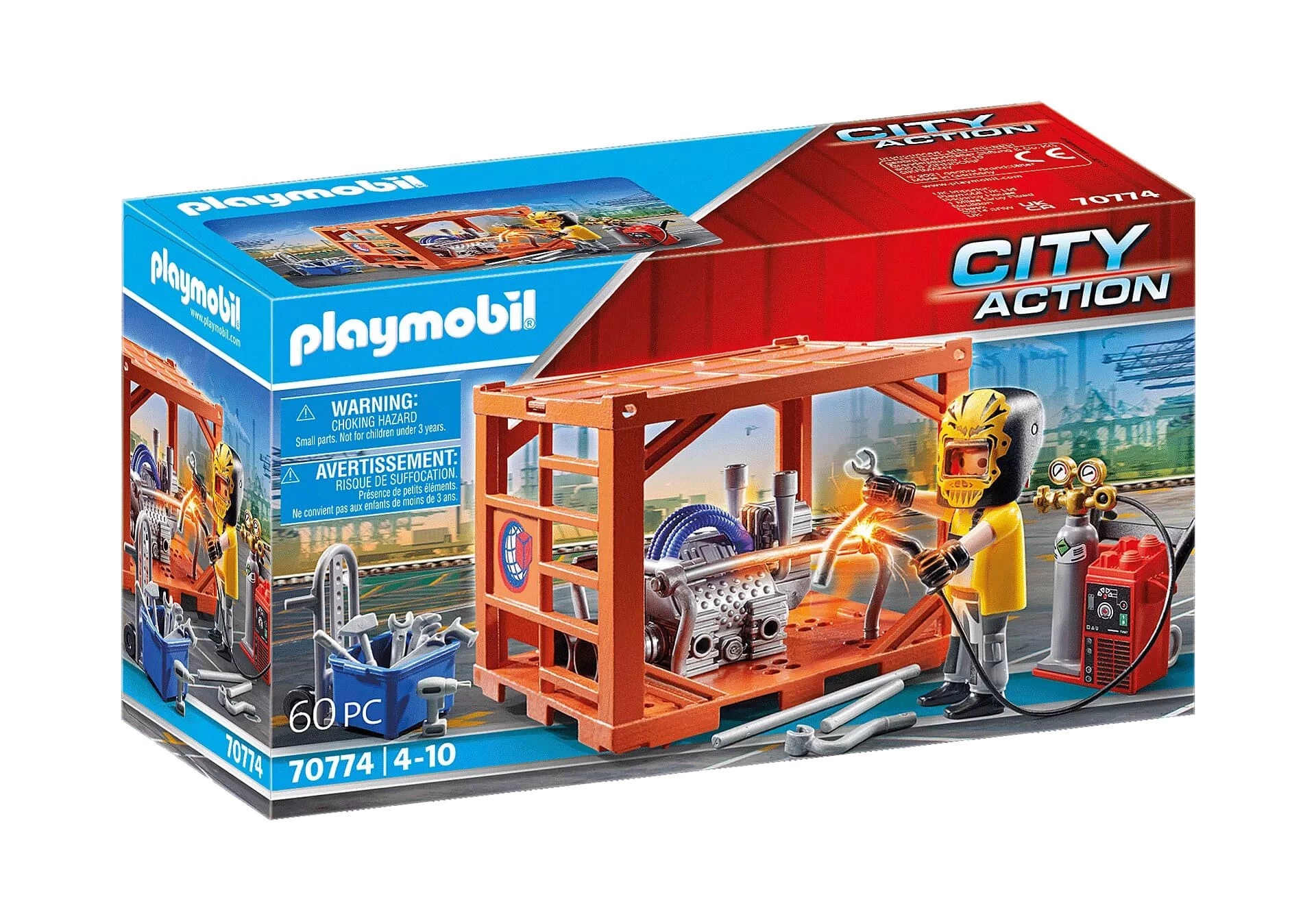 La seguridad es la máxima prioridad en el puerto. Los contenedores pesan toneladas y no deben abrirse accidentalmente ni resbalar durante el transporte. El soldador está revisando en estos momentos un contenedor. Una fijación se ha soltado. Inmediatamente se pone la máscara protectora, coge el equipo de soldadura y se pone a trabajar. El problema se resuelve en un abrir y cerrar de ojos. El set de juego contiene una figura PLAYMOBIL, un módulo de contenedor, un bloque de motor, herramientas y muchos otros accesorios.
