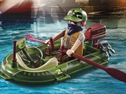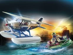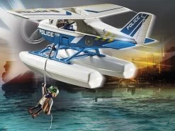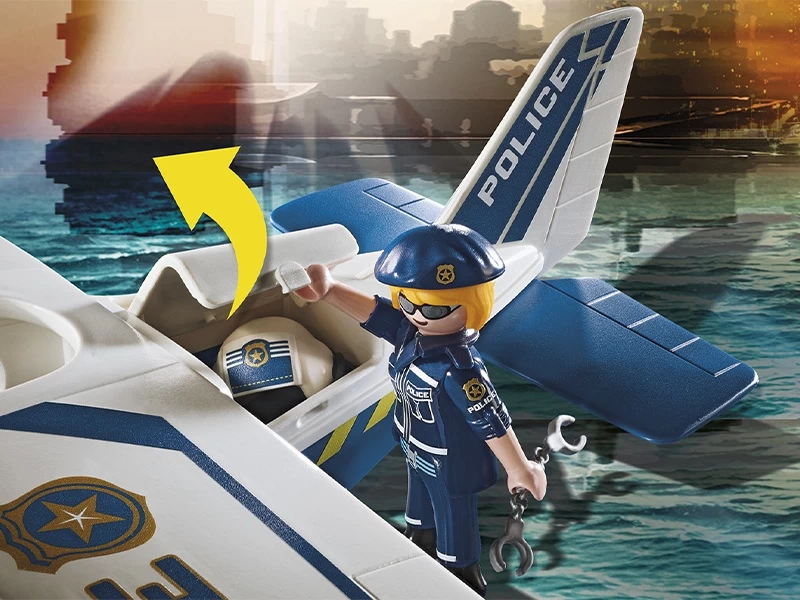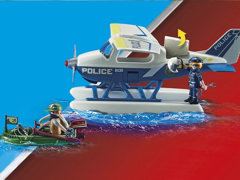 Los valientes polic铆as de PLAYMOBIL tambi茅n mantienen la ley y el orden en el aire. Un ladr贸n se da a la fuga con mercanc铆a de contrabando en el bote de goma. Pero el inteligente polic铆a piloto le vigila en todo momento desde la cabina y no le deja escapar. Aterriza h谩bilmente su hidroavi贸n en el lago y no le deja ninguna salida. Ahora el fugitivo est谩 esposado y se va al avi贸n y a la comisar铆a. El set de juego contiene dos figuras PLAYMOBIL, un hidroavi贸n, una lancha, un casco de piloto, una boina, unas esposas y muchos m谩s extras para vivir emocionantes aventuras policiales. El avi贸n puede flotar y la h茅lice puede girar.