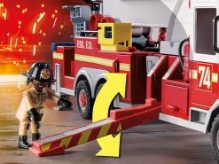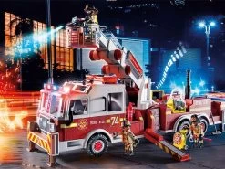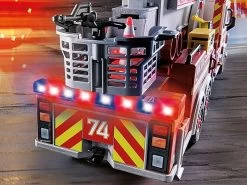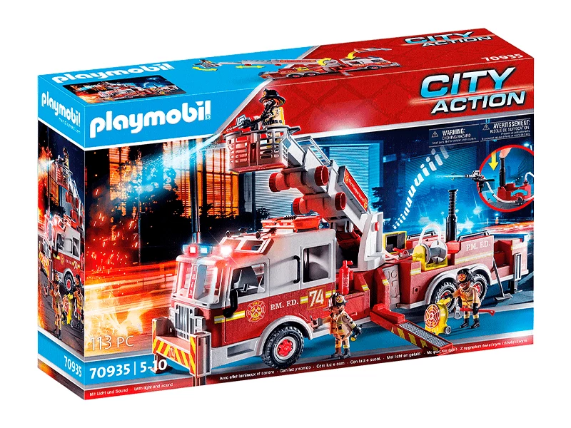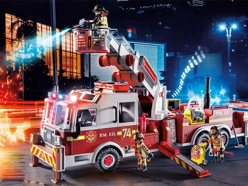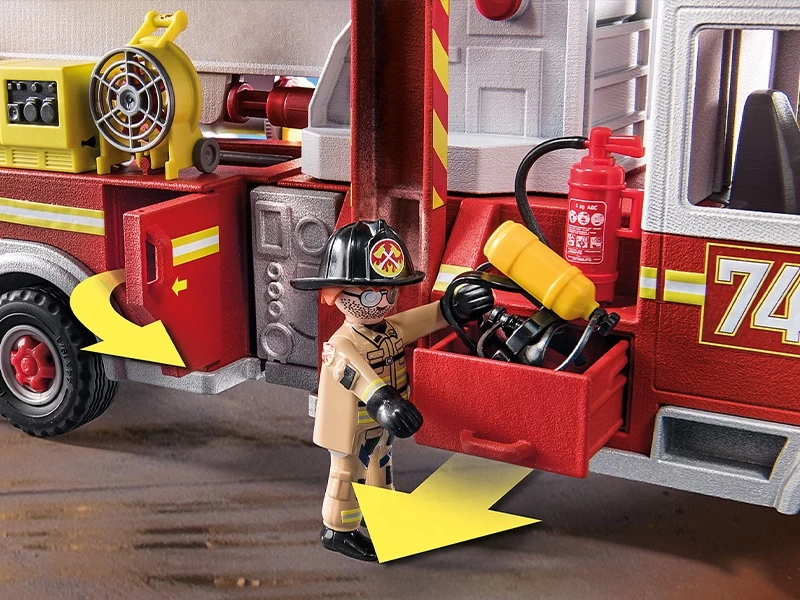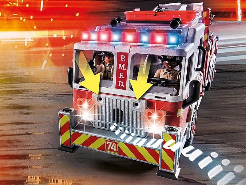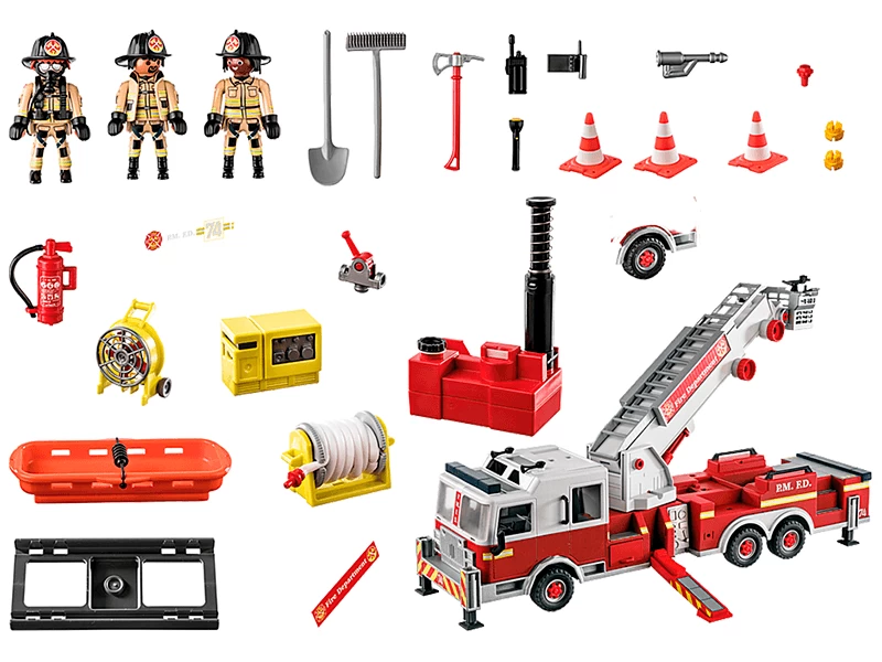 Nadie está en la escena tan rápido como la brigada de bomberos de PLAYMOBIL. Con su camión de bomberos bien equipado y equipo moderno, el equipo siempre está listo para extinguir, rescatar, ayudar y salvar. No importa cuán grande sea el incendio, cuán peligrosa sea la situación, los bomberos de PLAYMOBIL no tienen miedo de correr riesgos. Con luces azules intermitentes y sirenas, los servicios de emergencia se dirigen al lugar. Cuando llegan, se ponen una máscara de respiración y un cilindro de oxígeno y entran al edificio en llamas. Mientras tanto, los compañeros preparan la manguera y la bomba de agua y extienden la escalera giratoria. Gracias a sus valientes esfuerzos, el fuego pronto estará bajo control. El set contiene una bombera y dos bomberos, un camión de bomberos con luz y sonido, extintor de incendios, máscara de respiración, cilindro de oxígeno, cascos de bombero, guantes y otros equipos para recrear emocionantes misiones. El módulo de luz y sonido se puede controlar a través de un botón en la parrilla del radiador.