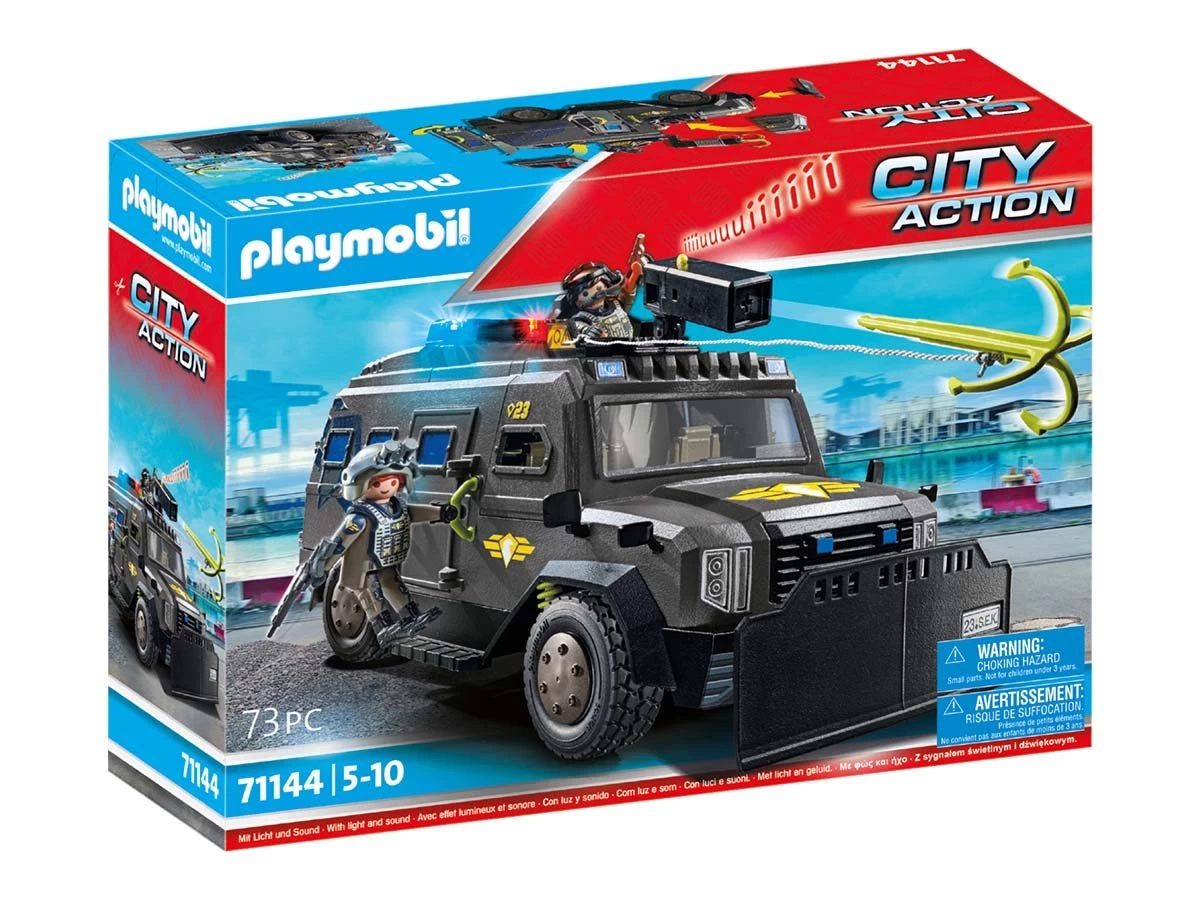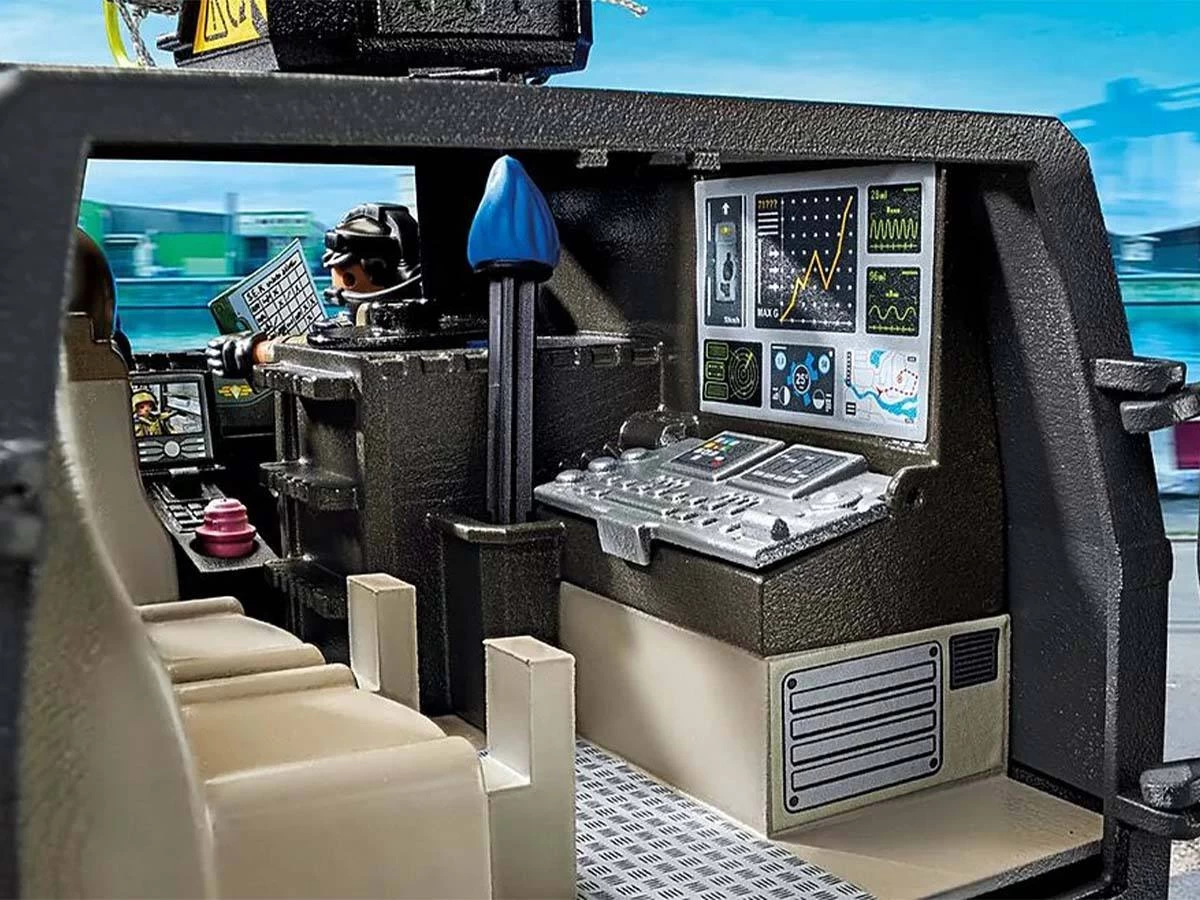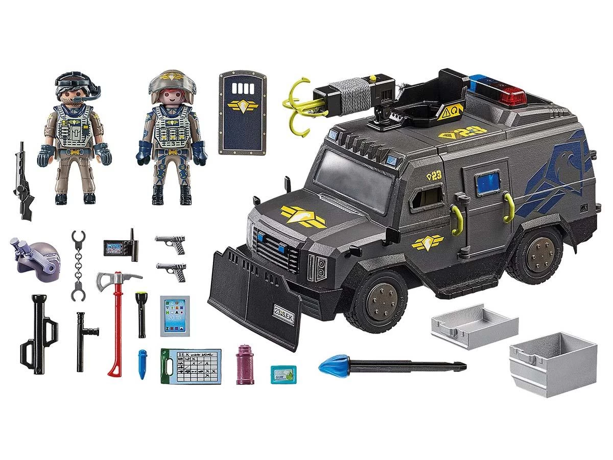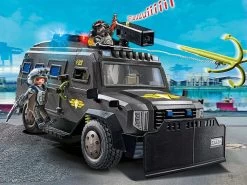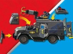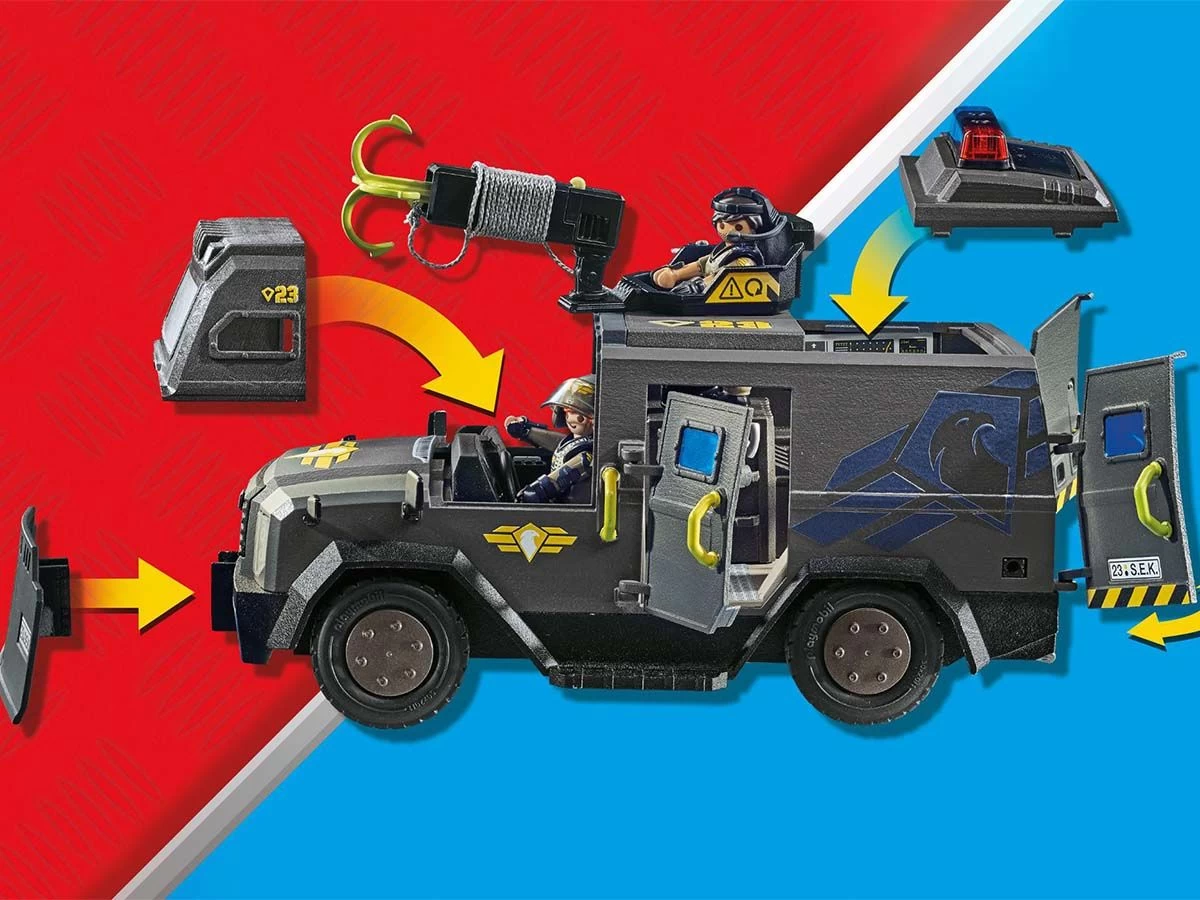 Moderno VehÃculo Todoterreno de las Fuerzas Especiales con luz y sonido, dos figuras PLAYMOBIL y numerosos accesorios para emocionantes operaciones policiales en la habitación de niñas y niños.