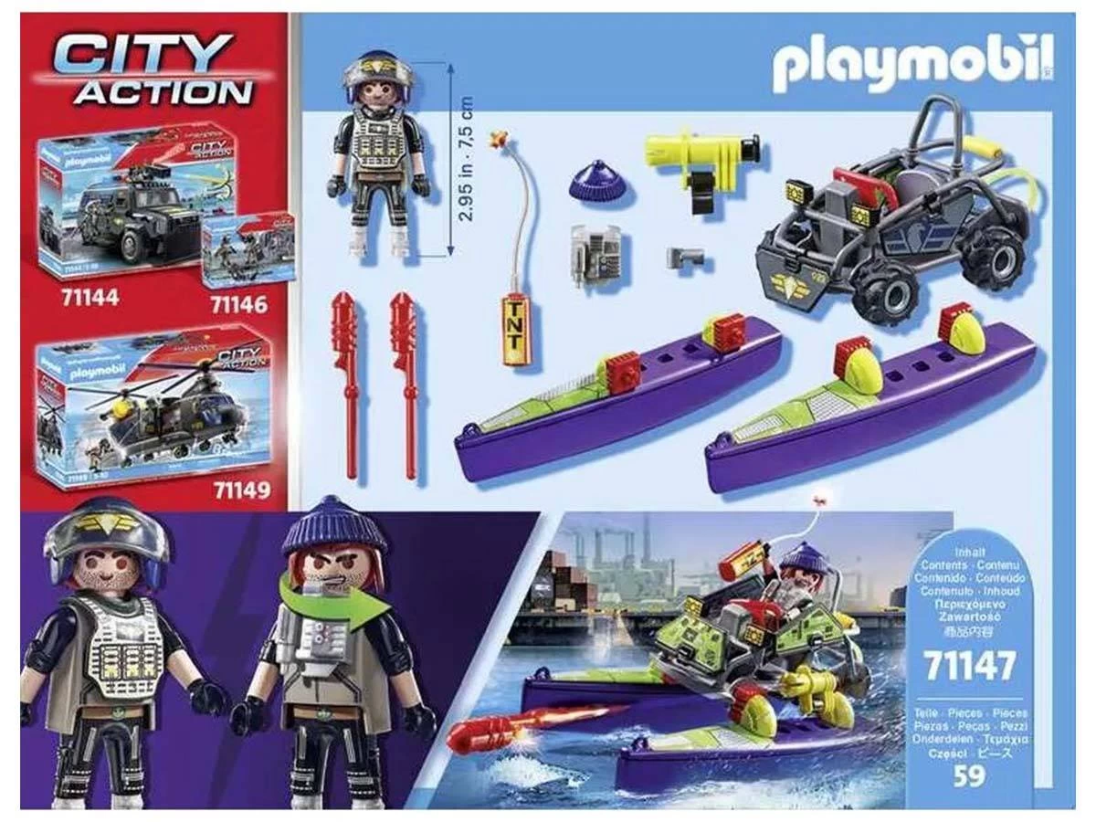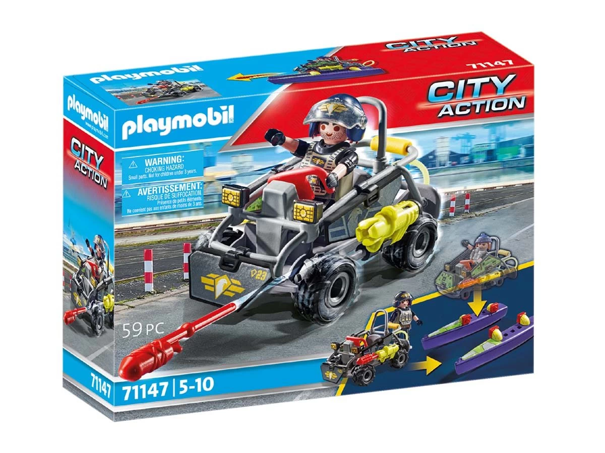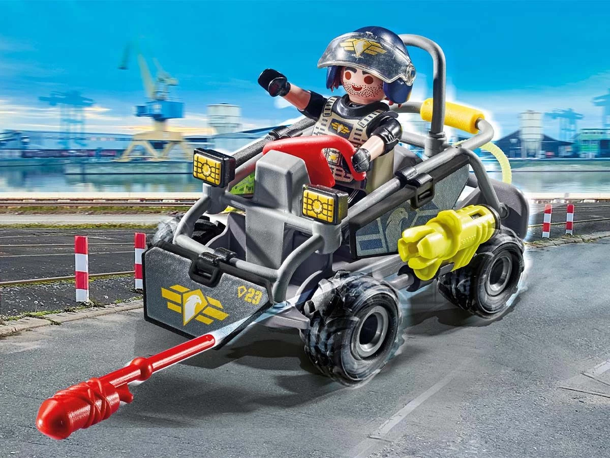 • El juguete de policÃa de 59 piezas incluye un quad transformable con cañón acoplable, dinamita, equipo de fuerzas especiales y una figura PLAYMOBIL.