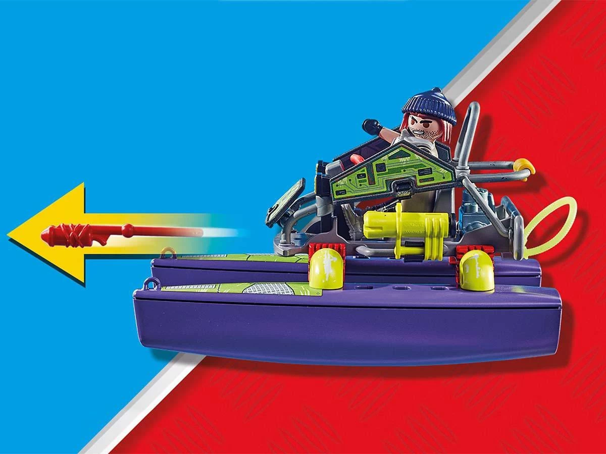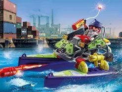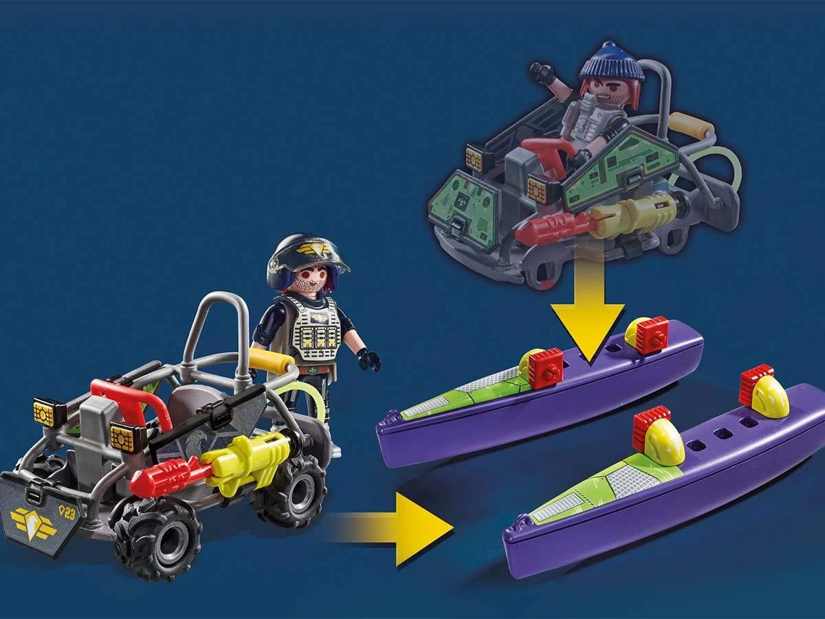 Quad Multiterreno que puede transformarse en lancha de forma rápida en un instante. Incluye una figura PLAYMOBIL y un gran equipo de fuerzas especiales para emocionantes juegos de rol en la habitación de niñas y niños.