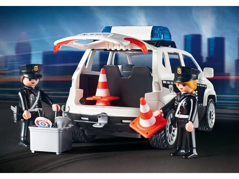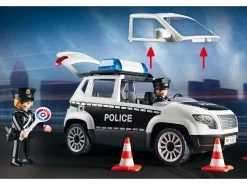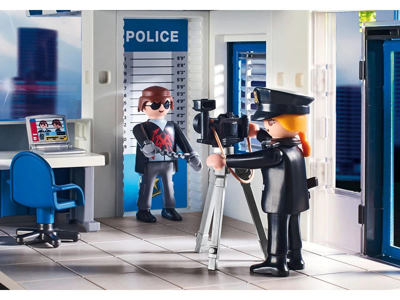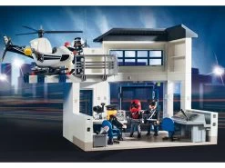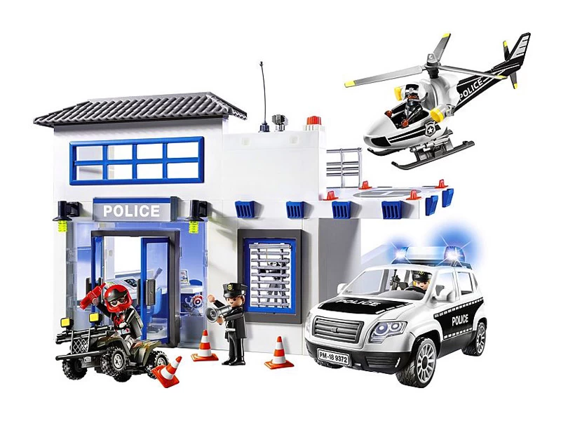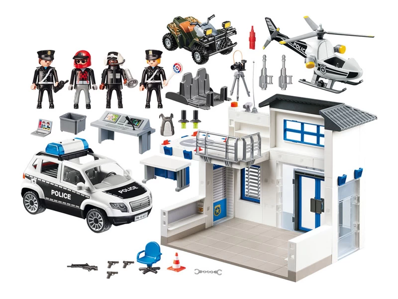 Pequeña comisaría de policía con mostrador de control, sala de reconocimiento, escritorio, silla y helipuerto. Incluye coche de policía con parte frontal que se quita, la puerta trasera se abre e incluye módulo de luz y sonido (1×1,5V AAA, no incluidas). Con helicóptero y quad. Incluye 4 figuras con complementos como señalización, cascos, gorras, megáfono, walki, pistolas, escopeta y esposas.