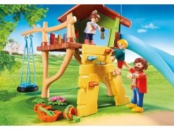 Accede a la casa a través de la red de escalada o por la pared de roca y deslÃzate por el tobogán. Incluye columpio, balancÃn y juguetes de arena.