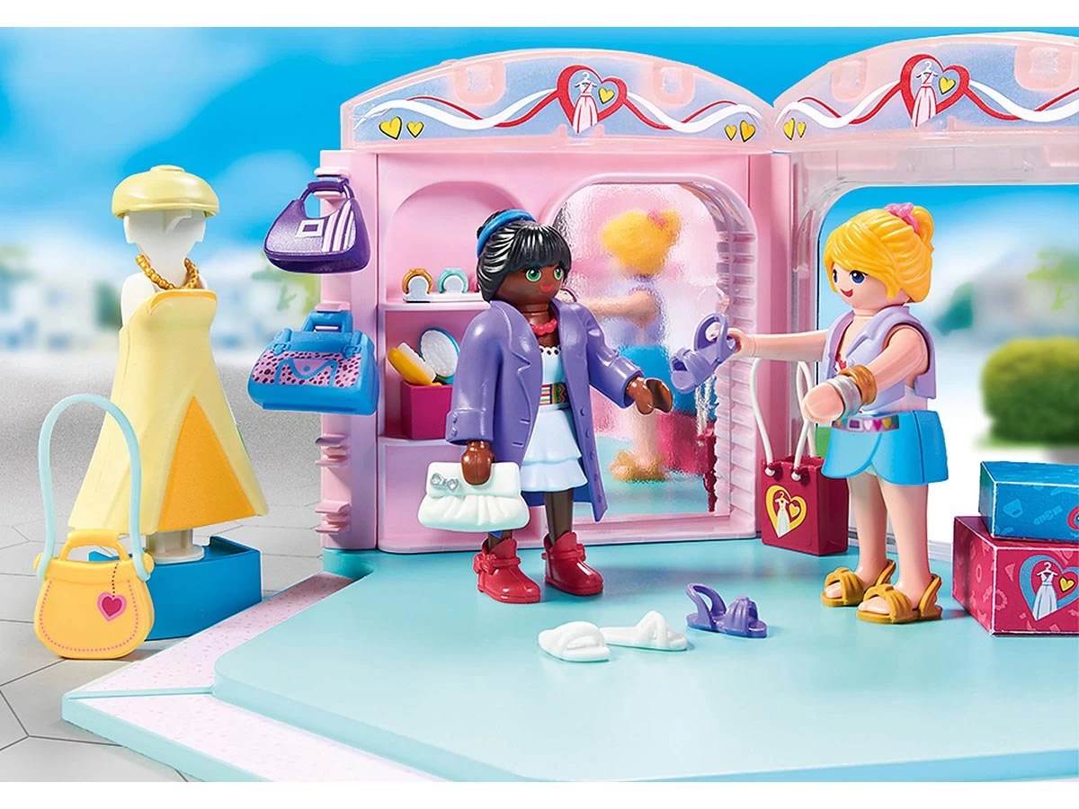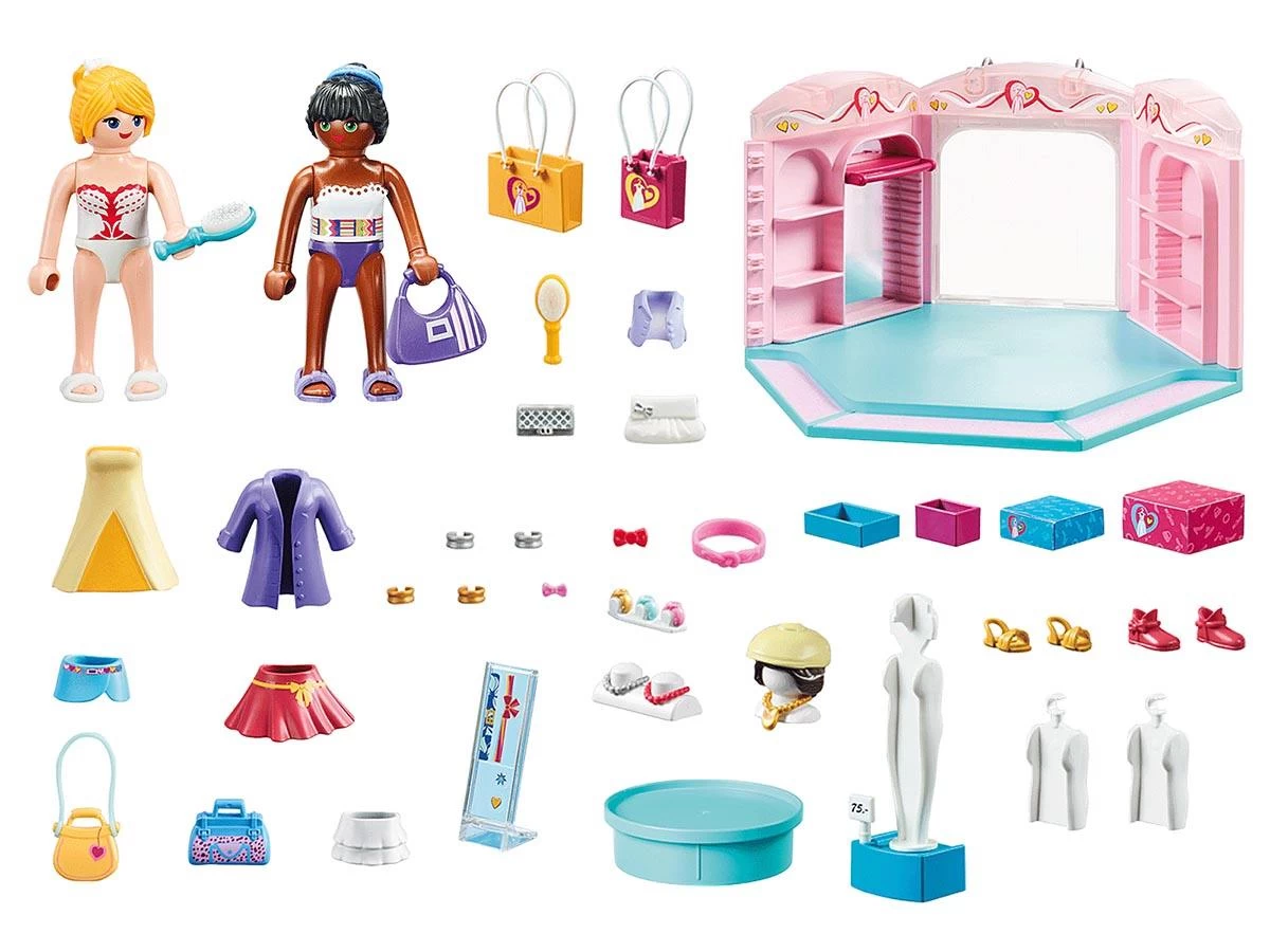 Es hora de hacer un divertido tour de compras. Así que vamos a la tienda de moda. Aquí puedes encontrar la moda más actual de la ciudad. Ya sean vestidos, zapatos, bolsos o joyas. Los amantes de la moda seguramente encontrarán el atuendo adecuado. Por supuesto, la amable vendedora siempre ofrece consejos y conoce los últimos consejos de estilismo. ¡Es la tienda ideal para una experiencia de compra perfecta! El juego incluye una tienda de moda con estantes, vestidos, zapatos, bolsos y muchos otros accesorios de moda, así como dos figuras de PLAYMOBIL. La ropa puede ser decorada con diferentes pegatinas. Combina la tienda de moda con el estudio diseño de moda (70590) y la tienda de moda infantil (70592) y construye una gran galería comercial.