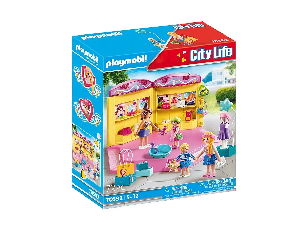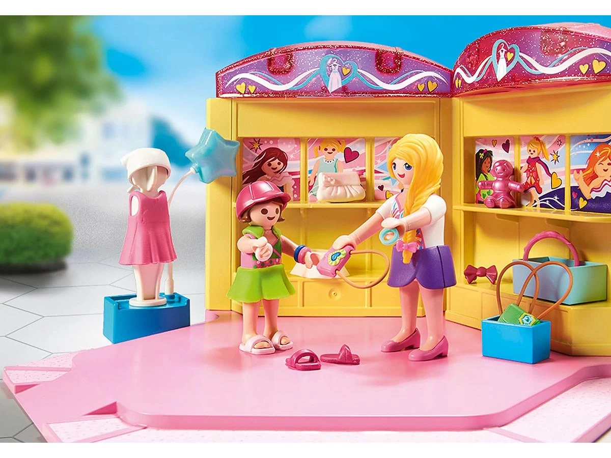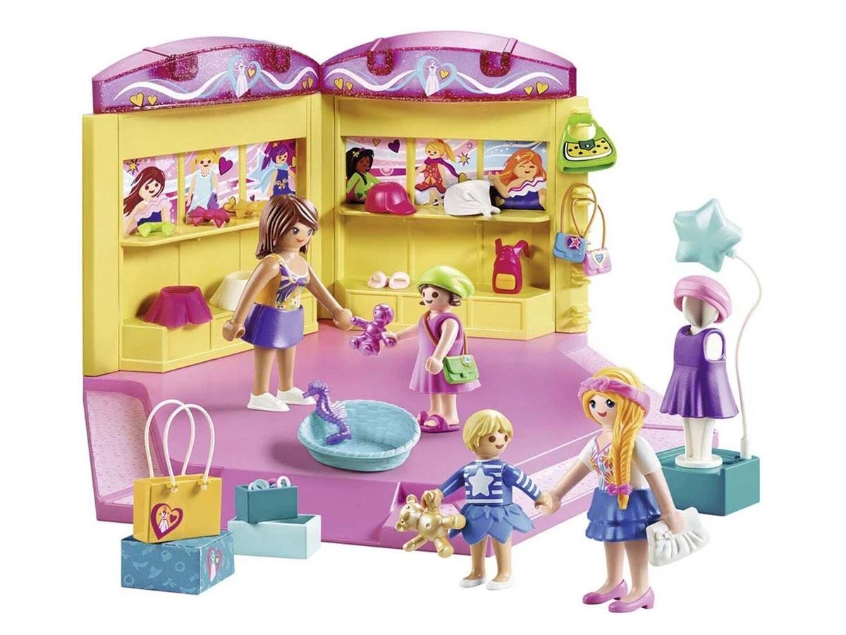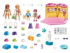 Por supuesto, los pequeños fashionistas también quieren conocer las últimas tendencias de la moda, y de esto se trata en la moderna tienda de moda infantil. Las estanterías en la pared ofrecen bolsos geniales, sombreros elegantes y por supuesto vestidos y faldas de moda para descubrir. ¿Qué deberías llevar primero? Por suerte, la querida mamá está ahí para ayudar con la selección. ¡Gran diversión de moda para los pequeños fans de la moda! El set incluye una tienda de moda infantil con cuatro figuras de PLAYMOBIL, así como espacio para faldas, bolsos, vestidos y otros accesorios de moda. La ropa puede ser decorada con diferentes pegatinas. Combina la tienda de moda infantil con el estudio diseño de moda (70590) y la tienda de moda (70591) y construye una gran galería comercial.