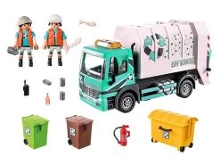 Hay mucho que hacer en la recogida de basura. Hay que vaciar todos los cubos y contenedores de basura del barrio. El conductor del gran camión se acerca con cuidado a los contenedores, su compañero sujeta el cubo de basura lleno en el soporte y abre la tapa. Ahora acciona la palanca y sube. Una vez que llega arriba, el contenedor se voltea y el material reciclable se vacía en la tolva del vehículo, luego el contenedor se vuelve a colocar en la calle. Al final del día va al centro de reciclaje. El set de juego incluye dos figuras PLAYMOBIL, un camión de reciclaje urbano con luces intermitentes y techo desmontable, dos cubos de basura, un contenedor de basura y otros extras. Para vaciar el camión, se desmonta la parte trasera y se pliega el accesorio del vehículo.
