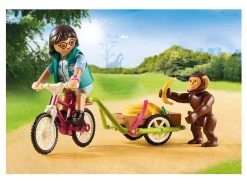 El veterinario del zoológico tiene mucho que hacer. Ya sea un chimpancé, una jirafa o un panda bebé, todos los animales del zoológico son atendidos rápidamente hasta que recuperan la salud en su práctica veterinaria. Primero, los pacientes son examinados en la mesa de operaciones con una lámpara, luego se realizan operaciones o se tratan las heridas y todos los animales son atendidos hasta que recuperan la salud. La comida para animales se almacena en el techo de la práctica. Cuando no está en su práctica, pasea en bicicleta por el zoológico y cuida a los animales en los recintos. Lleva alimentos y medicinas en el remolque de su bicicleta. El juego incluye un veterinario y una niña, una jirafa, un mono y un mono bebé, un panda bebé, dos tortugas, un edificio de práctica con mesa de exploración, estante, maletín médico y muchos otros extras para cuidar a los animales.