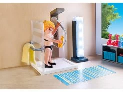 Equipado con ducha, inodoro, lavabo doble y una bicicleta de fitness. La columna de luz funciona (necesita 1×1,5V AAA, no incluidas). Incluye 2 figuras, estante, vestido, toalla de baño, báscula, 2 cajas, 2 cestos, un par de zapatillas, botellas de cosméticos, 2 cepillos de dientes, peine, secador, alfombra, dos tazas y escobilla.