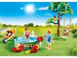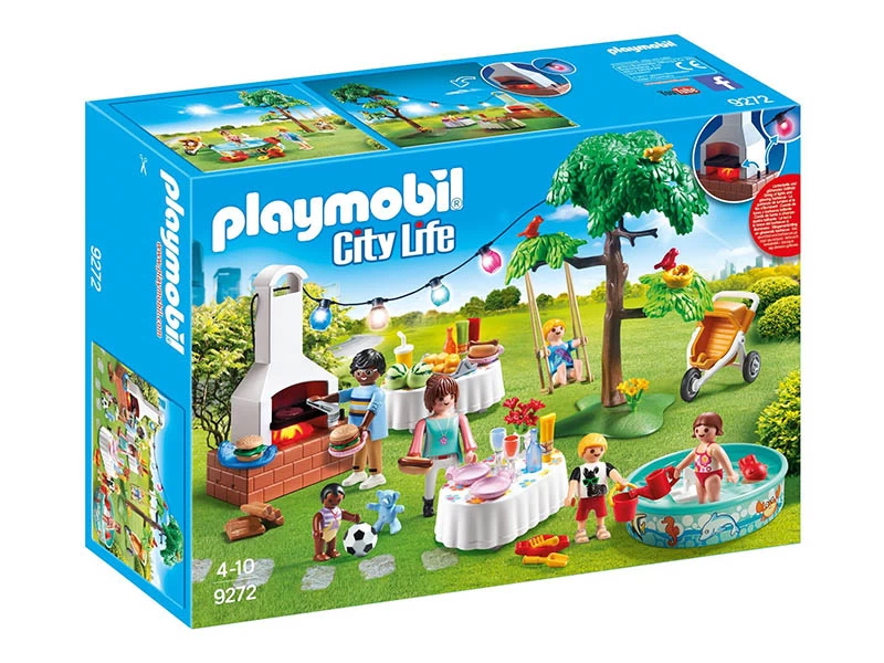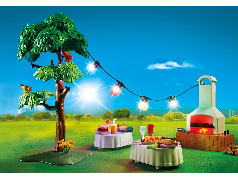 Un buffet en el jardín con una fantástica barbacoa (necesita 3 pilas 1,5V-AAA, no incluidas). En el árbol se puede colgar el columpio para que los niños se columpien. Incluye 6 figuras (2 adultos, 2 niñas, 1 niño y un bebé).