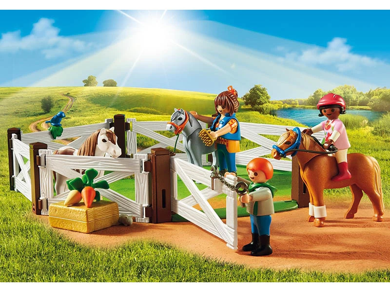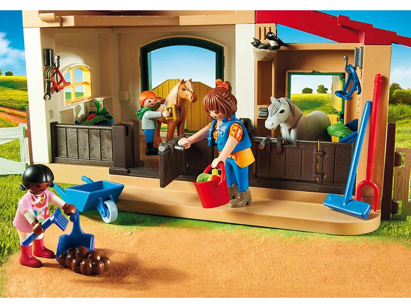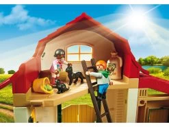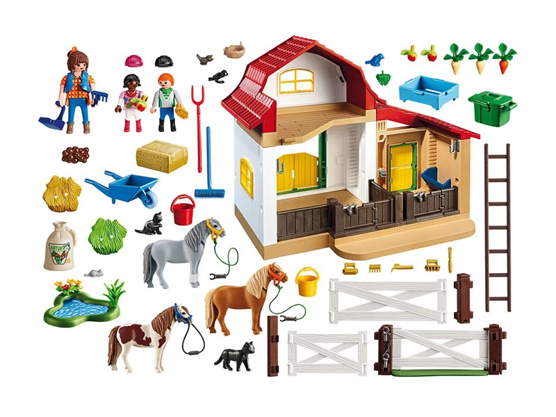 La granja tiene dos establos, granero para almacenar la paja y una escalera para poder subir. Incluye vallas que cierran el patio de la granja para que los animales puedan ser atendidos en el exterior junto a un pequeño estanque. Contiene 3 figuras, 3 ponis, 2 gatos, carretilla y varias herramientas.