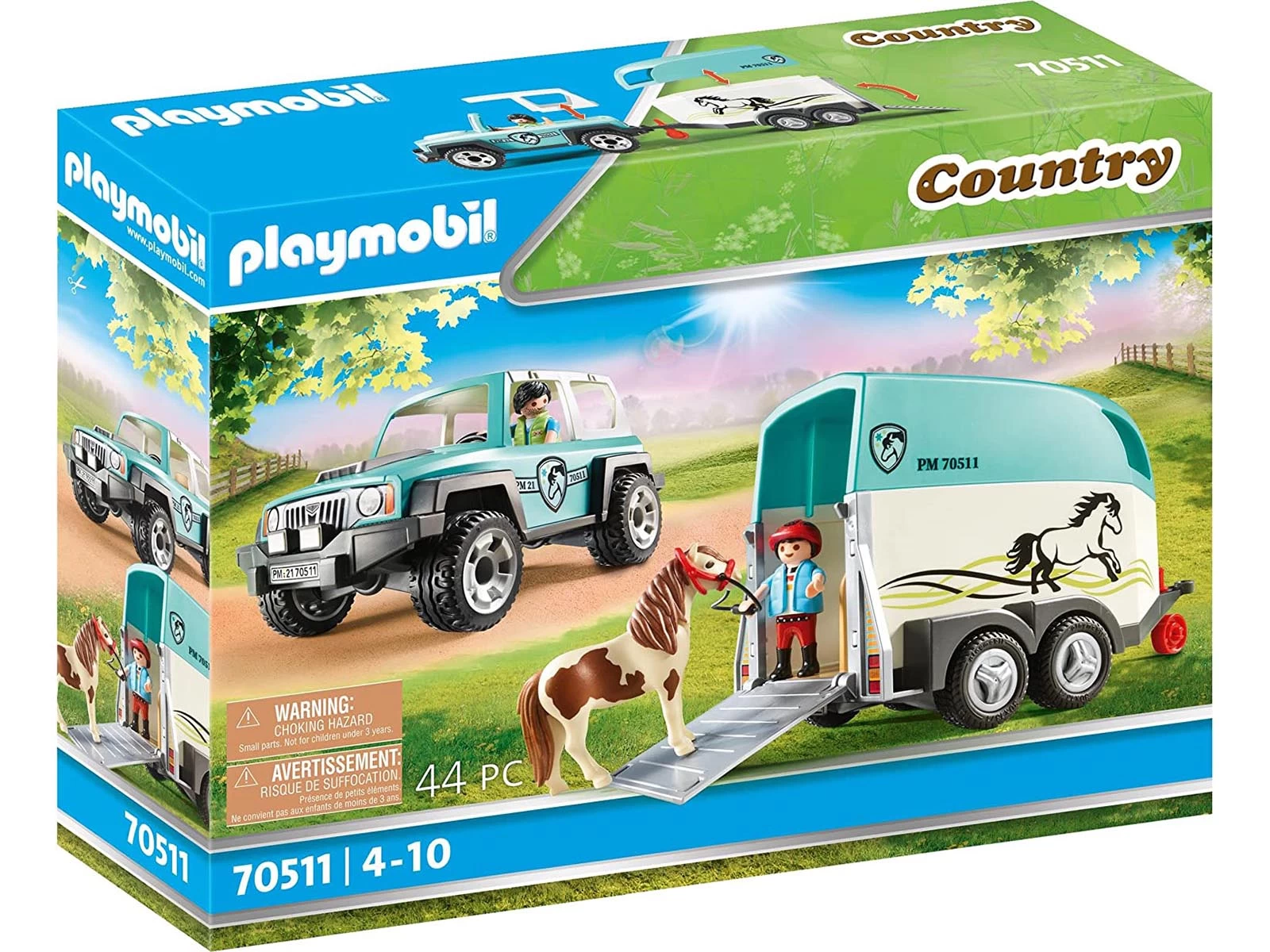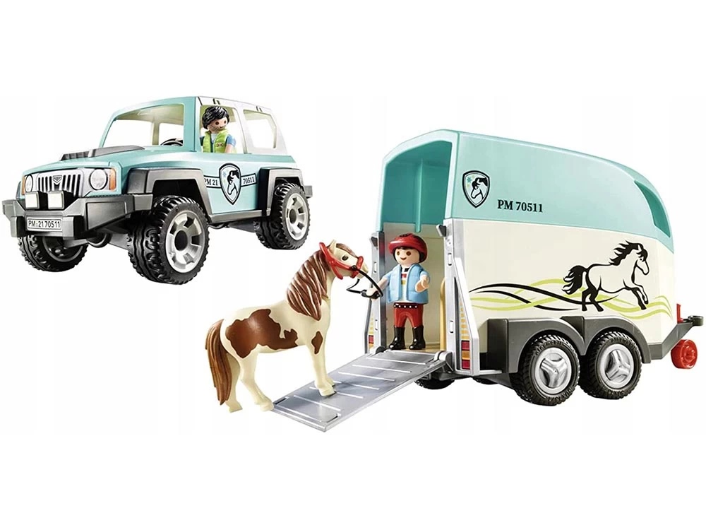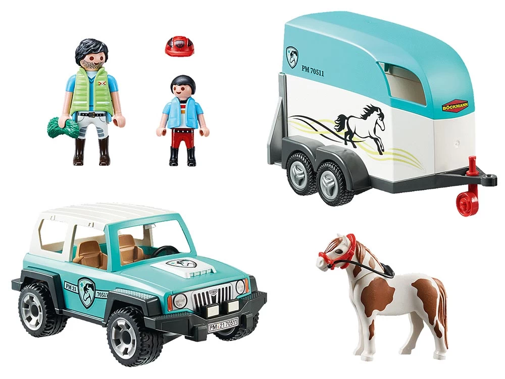 Si un poni necesita ir al veterinario, se le transporta en el coche con remolque. El niño acompaña cuidadosamente a su poni por la rampa hacia el remolque. Esto no es tan fácil, pero juntos lo manejan. Una vez que el poni está en el remolque, la rampa se dobla y el remolque se acopla al coche. Con cuidado el conductor se aleja, el poni no debe asustarse. El juego contiene un coche con remolque de poni, dos figuras de PLAYMOBIL, un poni y otros extras. El techo del coche y el remolque se pueden quitar.