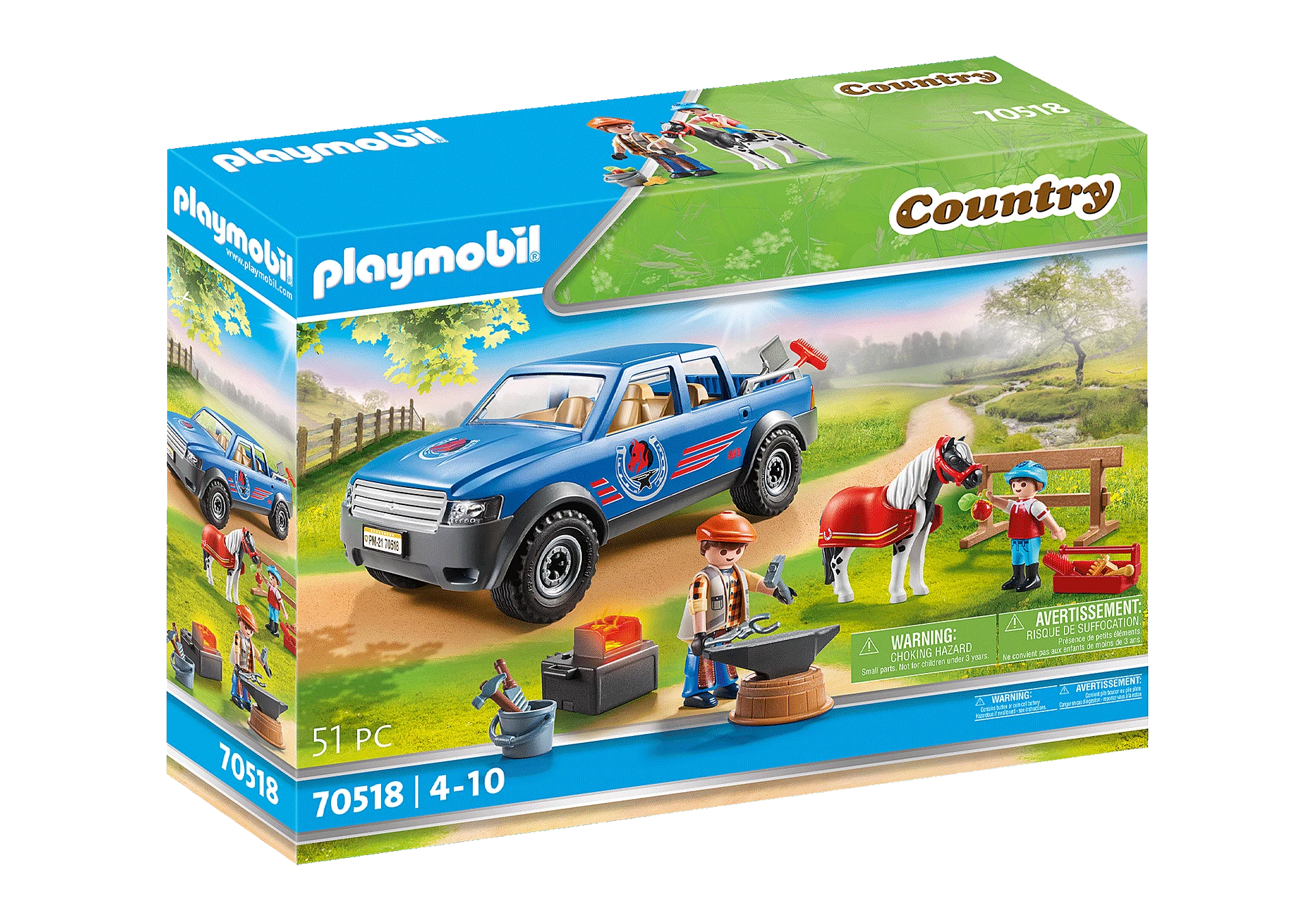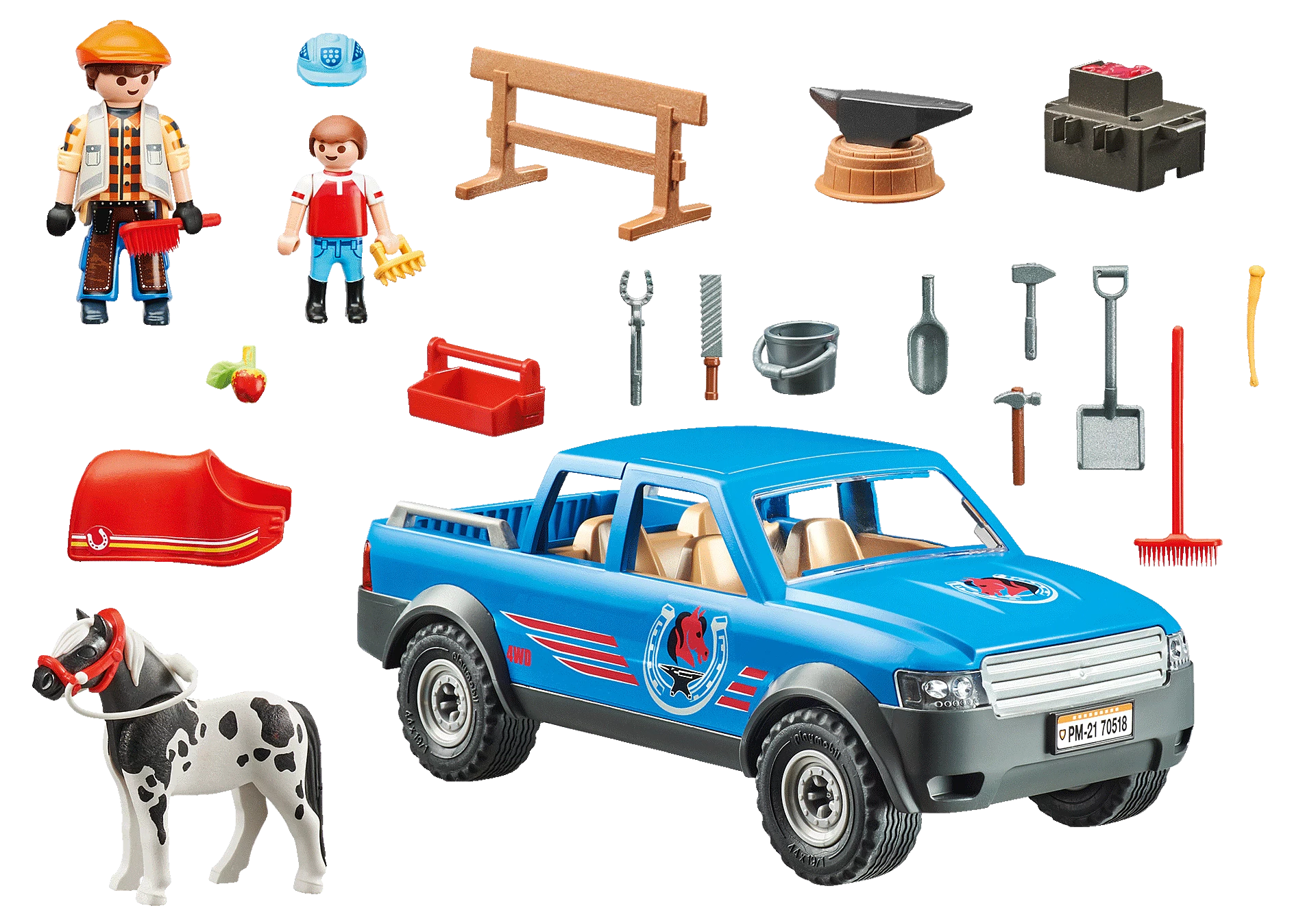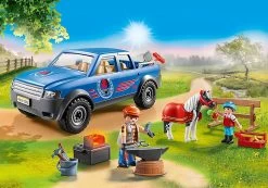 Vacaciones a caballo: es el sueño de muchos niños y niñas. Siempre hay mucho que experimentar en la granja de ponis. Hoy se ha presentado el herrador ambulante. Acaba de llegar a la granja en su camioneta azul. Lo tiene todo en la zona de carga del amplio camión: yunque, fragua, alicates, martillo, lima y pala. Revisa con pericia los cascos de los ponis. Hay mucho que hacer. El herrador enciende el fuego y prepara todo para herrar a los caballos. Al final del día, todos los ponis están equipados con herraduras nuevas. El set de juego incluye una figura PLAYMOBIL, un poni, una camioneta con enganche de remolque, una fragua móvil con asas, yunque, martillo, pinzas con herraduras, pala y muchos otros accesorios. Las brasas de la fragua se pueden encender mediante un botón en el lateral y se apagan automáticamente después de 90 segundos.