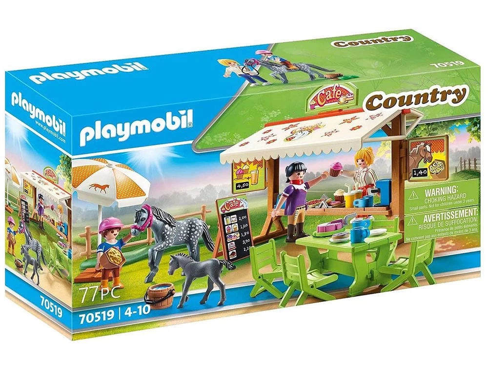 Con puesto de venta y muchos accesorios para pasar una tarde en la cafetería Poni. Incluye comida para poni en forma de herradura.