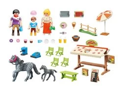 ¡Las clases de equitación son bastante agotadoras! Tomemos un descanso en la acogedora Cafetería Poni. Aquí, todos incluso los ponis, pueden relajarse después de una intensa sesión de entrenamiento. Deliciosos pasteles, tartas dulces y sabrosas cupcakes les tientan en el mostrador, acompañados de una taza de café o té. Por supuesto, los ponis tampoco tienen que limitarse a mirar y se les ofrece agua y una deliciosa comida en forma de herradura. ¡Estas vacaciones a caballo son muy divertidas! El set de juego contiene dos figuras PLAYMOBIL y una figura infantil, un poni y un potro, un puesto con techo solar y caja registradora, una mesa y cuatro sillas, una sombrilla, pastel, cupcakes, comida para ponis y muchos otros encantadores extras para una relajante pausa para el café.