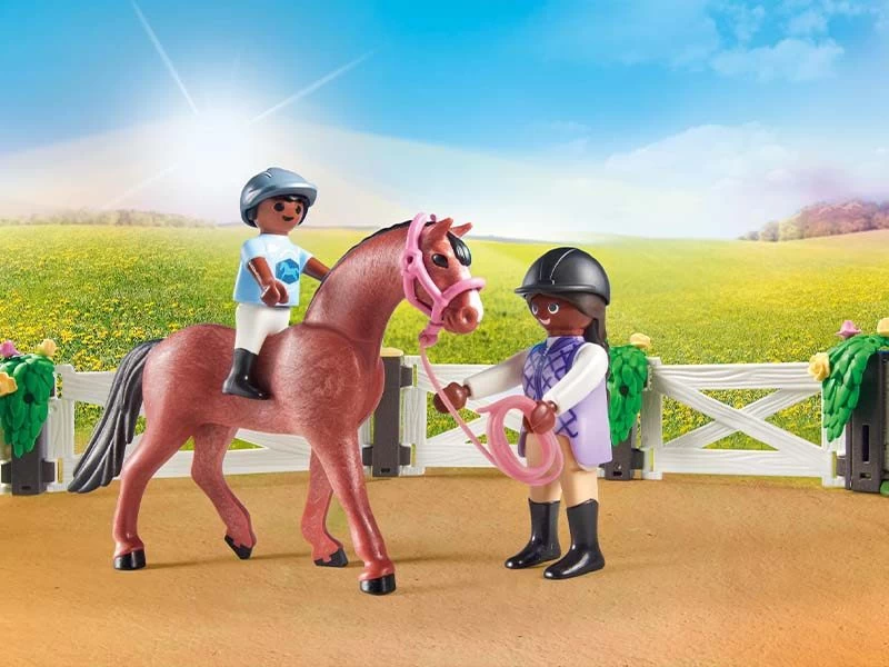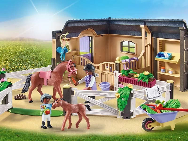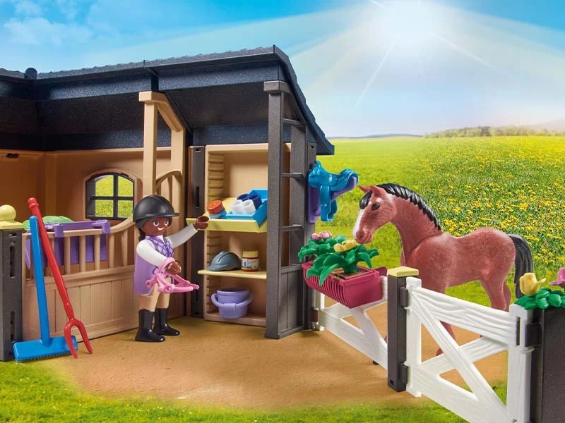 ¡Mucha diversión en el Establo de PLAYMOBIL! Este detallado set hará las delicias de los aficionados y aficionadas a los caballos. En el box, los simpáticos niños cuidan al querido caballo y al pequeño potro. Asear, cepillar y, por supuesto, limpiar el establo, todo forma parte de la rutina diaria. Después del entrenamiento, la silla de montar, el cabestro, las riendas y el casco se limpian y se guardan cuidadosamente.