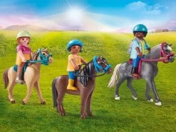 El colorido juego de caballos de 67 piezas, a partir de 4 años incluye tres figuras PLAYMOBIL, dos caballos, un poni, un border collie, así como cascos de montar, sillas de montar y un picnic. Las figuras adultas pueden montar los caballos con sillas de montar. A todas las figuras se les puede quitar el casco. Para que el juego sea aún más divertido, puede combinarse con los otros juegos de la gama Country de PLAYMOBIL.