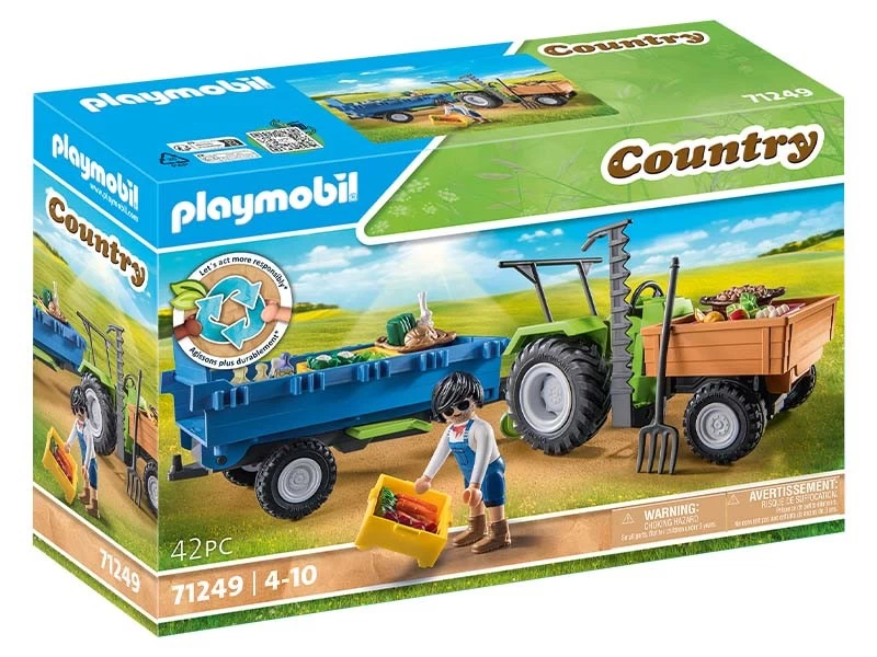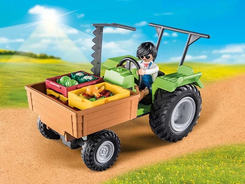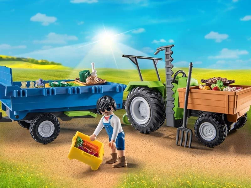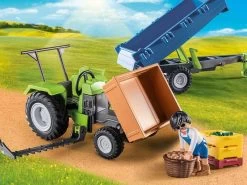 Ayuda al granjero a trabajar en el campo con el Tractor con remolque de PLAYMOBIL. Con accesorios realistas, como la zona de carga y los grandes neumáticos, el tractor ofrece una experiencia de juego creativa. Las frutas y verduras son cosechadas frescas del campo y se colocan en las cajas de transporte para transportarlas a la tienda para su venta.