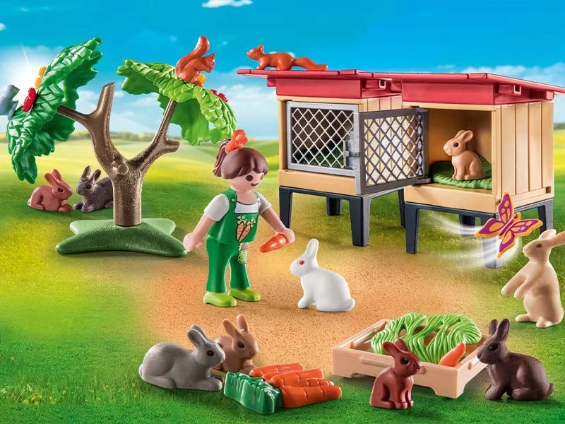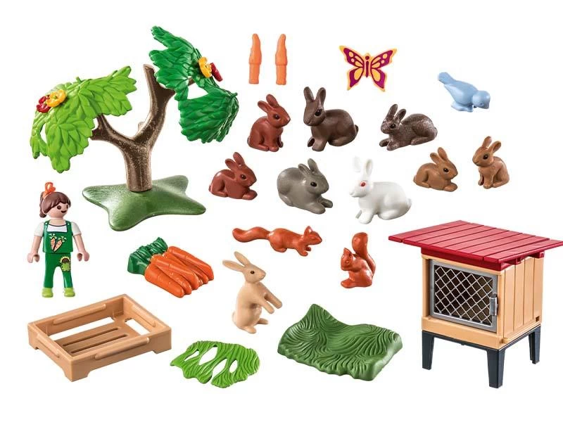 • El set de juguetes de 41 piezas incluye una figura infantil PLAYMOBIL, una conejera, nueve conejos, dos ardillas, una paloma, forraje verde, zanahorias y otros encantadores extras.