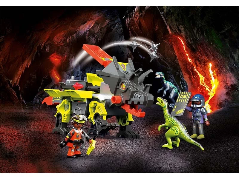 Lucha contra el enemigo con el Robo-Dino. Con este robot, los villanos de Comet Corp. intentan superar el poder natural de los dinosaurios usando tecnologÃa pura. La Máquina de Combate con forma de triceratops funciona con cristales de energÃa que se almacenan en un compartimento secreto dentro de la máquina. Una vez encendido, el Robo-Dino usa los cañones y la catapulta que dispara para defender al grupo minero. El juego incluye al miembro del equipo Dino Rise, Jaden, un minero, dos velocirraptores, un Robo-Dino, dos cañones con proyectiles, cristales de energÃa y otros accesorios.