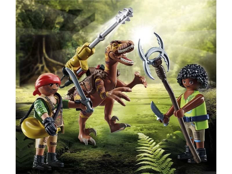 ● El set de juguete incluye al héroe de Dino Rise, Jaden, y otra figura PLAYMOBIL, un Deinonychus con armadura desmontable, así como cuchillo, lanza, cañón y otros extras para un emocionante juego de rol de dinosauros.