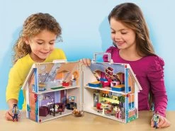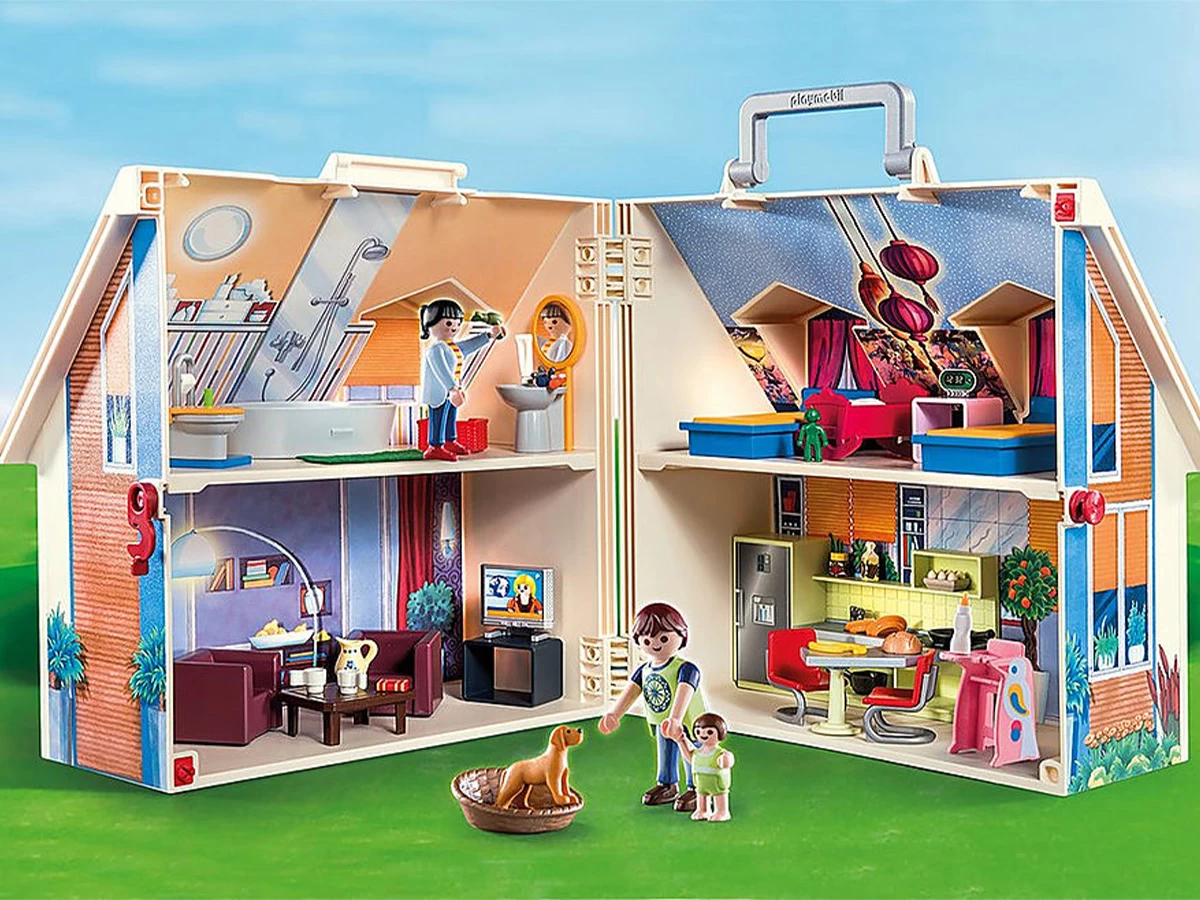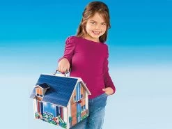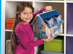 Amueblado de forma moderna con amplia cocina, cómoda sala de estar, baño para sentirse bien y dormitorio principal con cuna para bebé. Todos los accesorios se pueden guardar en la casa plegable. Con práctica asa de transporte para llevar a cualquier parte. Dimensiones casa desplegada: 52 x 12 x 27 cm (LxPxH).