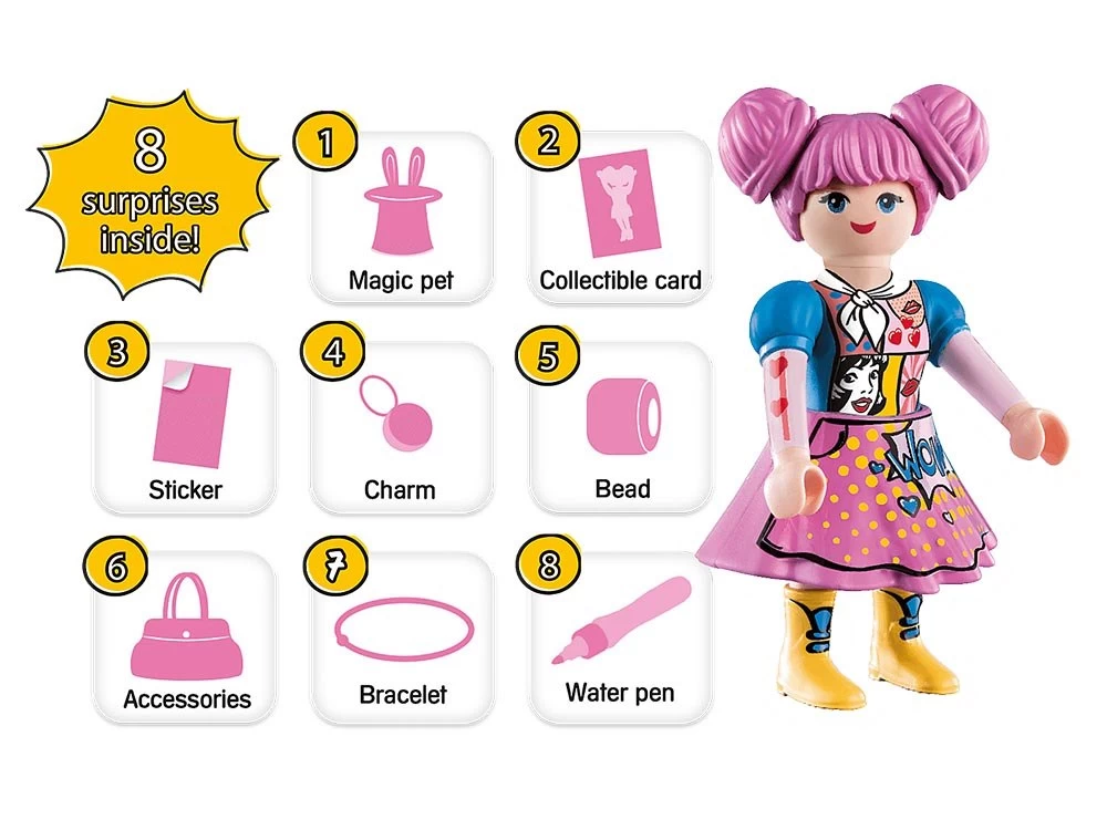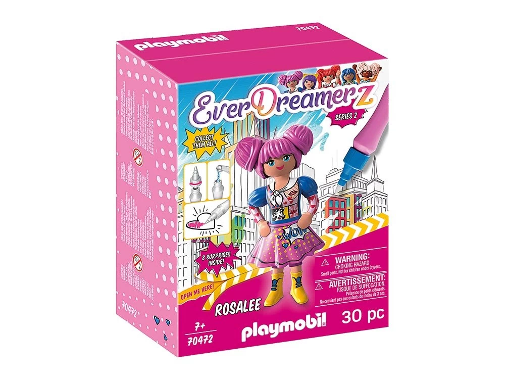 Divertida, cálida y alegre, Rosalee siempre piensa en positivo. También sabe escuchar a sus amigas. Incluso, si no están de acuerdo siempre, ella intenta crear armonÃa. Incluye una pulsera de silicona, perla y colgante con el signo de la victoria, carta para coleccionar, pegatina y muchos accesorios. Las pegatinas adjuntas se pueden pintar con el nuevo boli de agua de PLAYMOBIL.