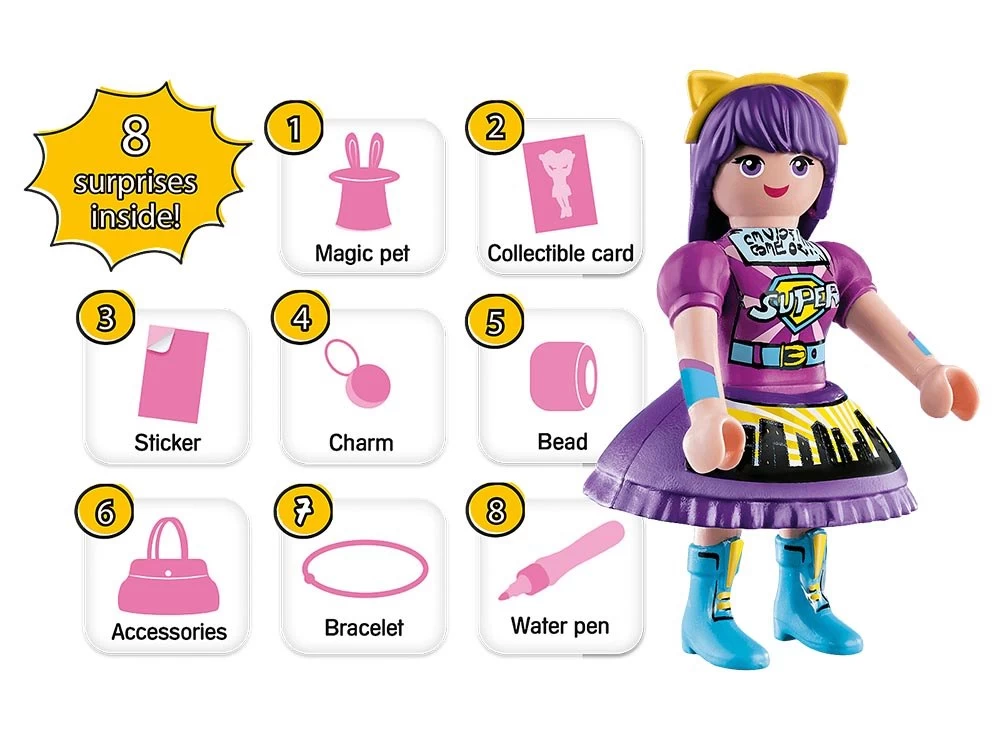 Viona es la misteriosa soñadora del grupo. Le gusta expresar sus sentimientos a través de poemas y pinturas, preferiblemente en púrpura. Su talento artÃstico salva muchas veces a las chicas de situaciones difÃciles. Incluye pulsera de silicona, perla y colgante en forma de boli, carta para coleccionar, pegatina y muchos accesorios. Las pegatinas adjuntas se pueden pintar con el nuevo boli de agua de PLAYMOBIL.