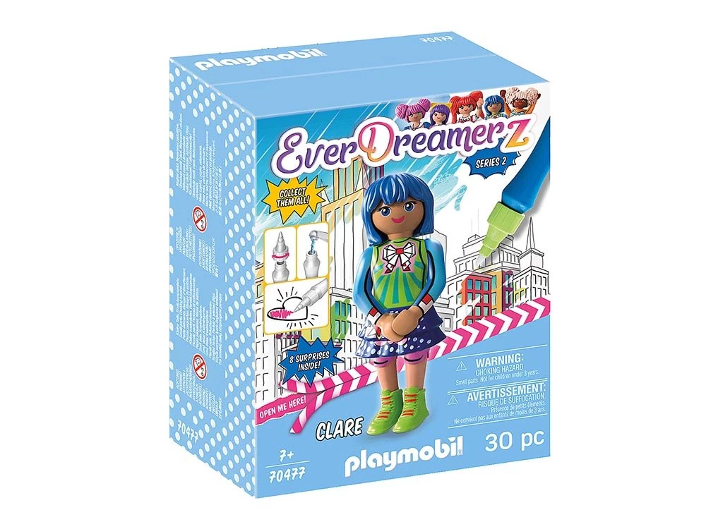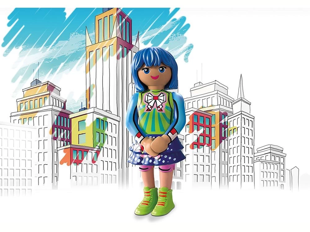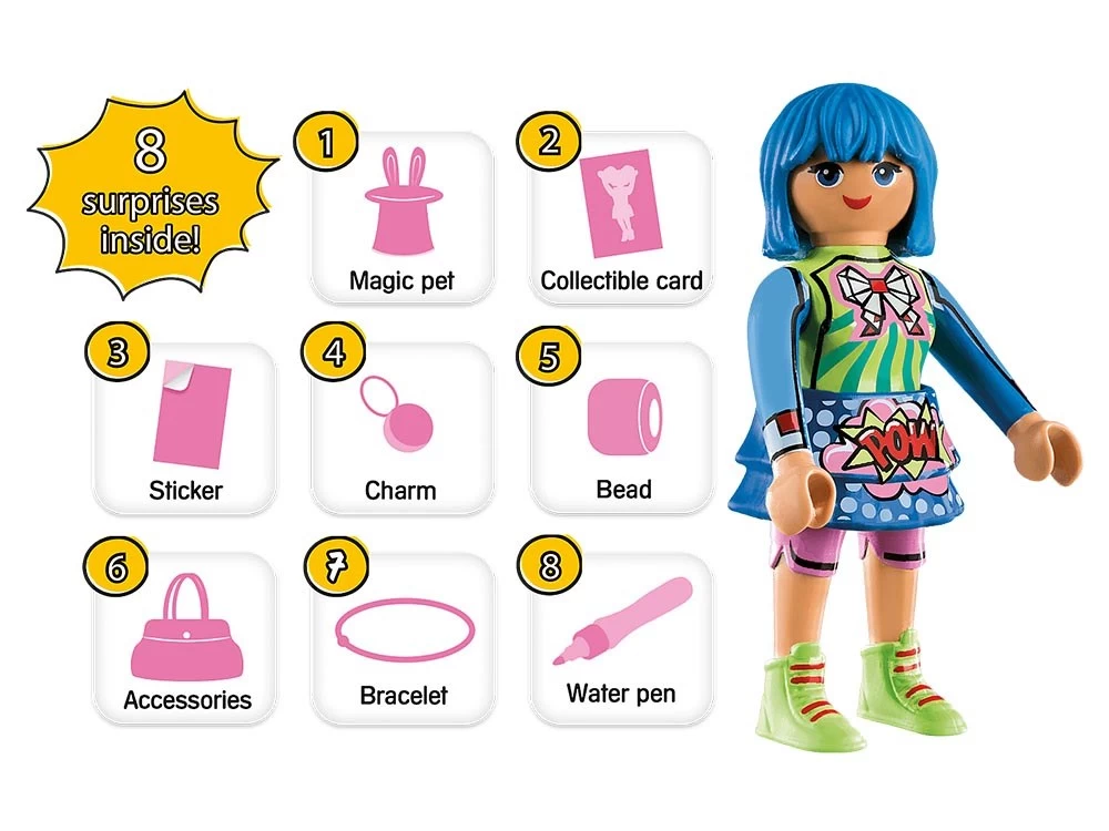 ¡Clare es el cerebro del grupo y le encantan las formas geométricas! Incluye pulsera de silicona, perla y colgante en forma de avión de papel, carta para coleccionar, pegatina y muchos accesorios. Las pegatinas adjuntas se pueden pintar con el nuevo boli de agua de PLAYMOBIL.