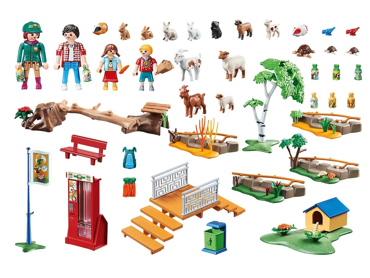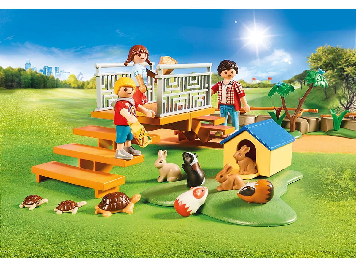 El zoo de mascotas se puede diseñar según los elementos de delimitación. Incluye plataforma de observación y dispensador de alimento.