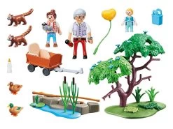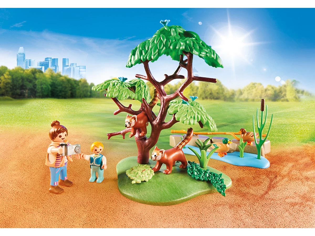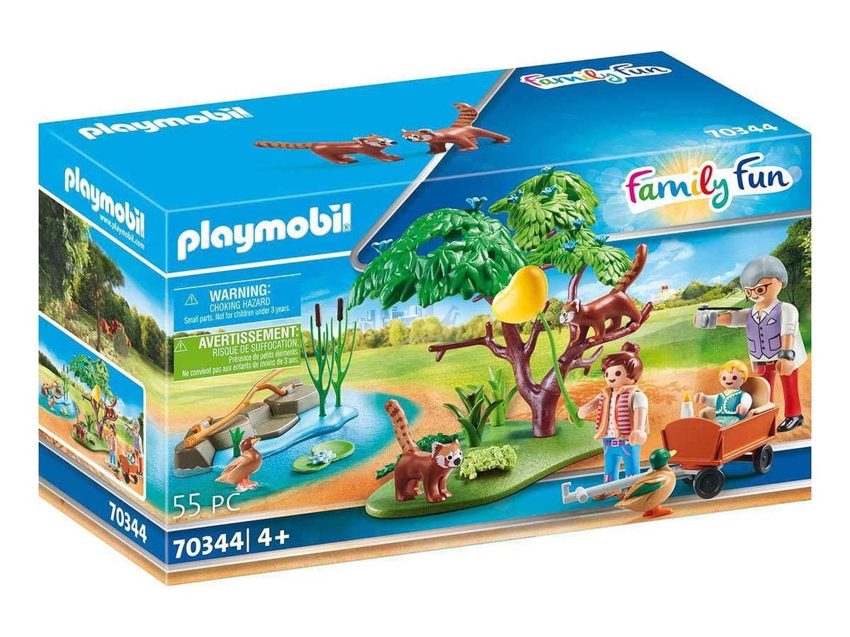 El abuelo y sus nietos visitan a los pequeños pandas en el recinto al aire libre. El asiento para niños se puede quitar.