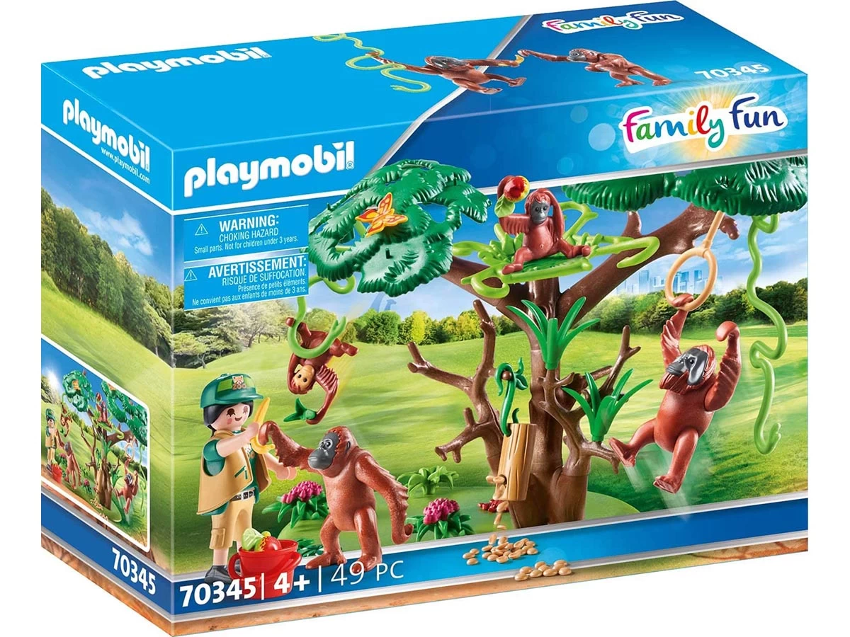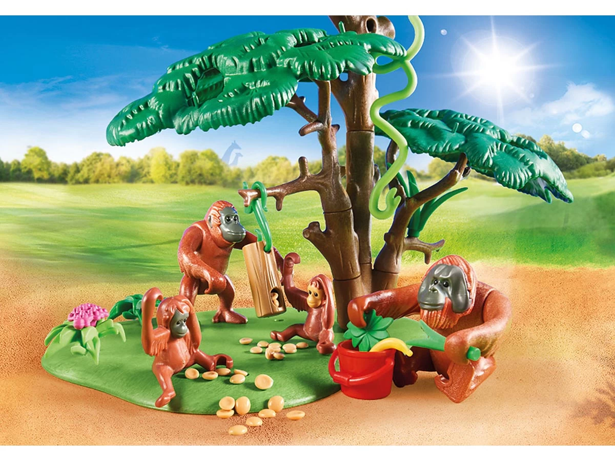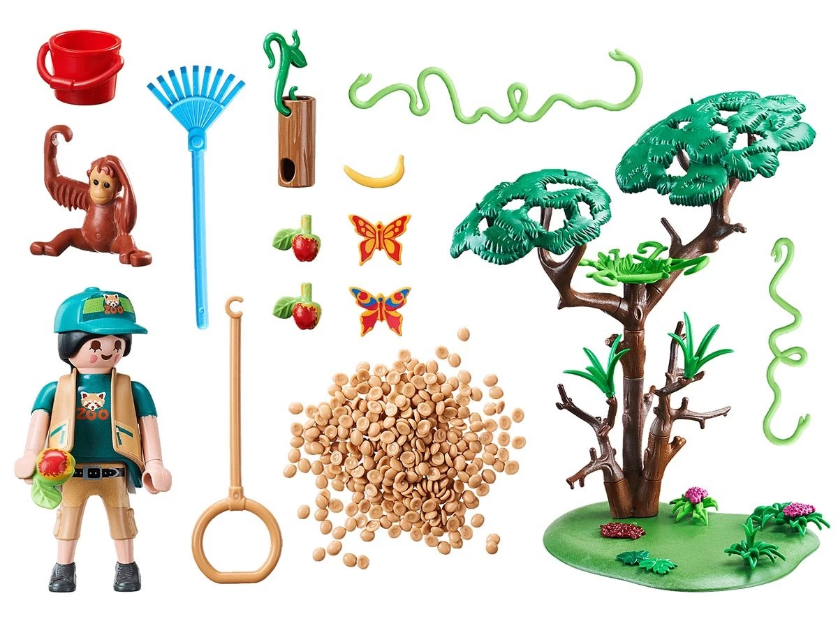 Los orangutanes pueden aferrarse a las diferentes ramas y lianas y balancearse de rama en rama. Incluye un tubo de madera lleno de comida, un columpio y un cuidador de animales.