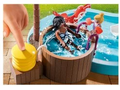 Chapotea durante todo el día en la piscina infantil. El bebé se balancea alegremente arriba y abajo en el columpio y da patadas al agua con los pies. Tras el balanceo, la mamá prueba el hidromasaje, mientras la niña se mece alegremente en el gran balancín. Mientras tanto, un pequeño bebé cocodrilo trepa por la frondosa enredadera y observa los felices acontecimientos en la piscina. El set de juego incluye tres figuras PLAYMOBIL, una madre y dos niños en traje de baño, una piscina infantil con tobogán, un columpio para bebés y un balancín de muelle, un bebé cocodrilo, una palmera y muchos otros extras para divertirse en el agua.