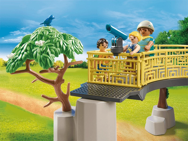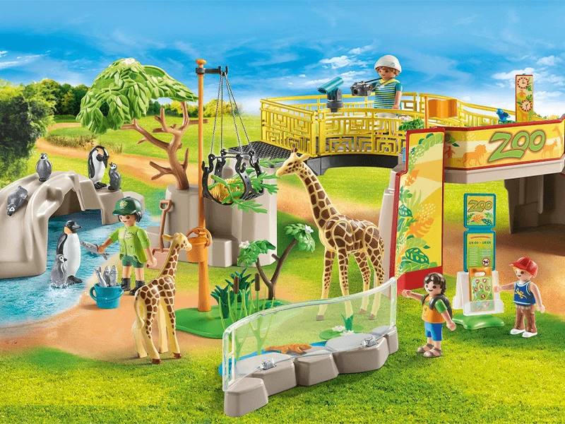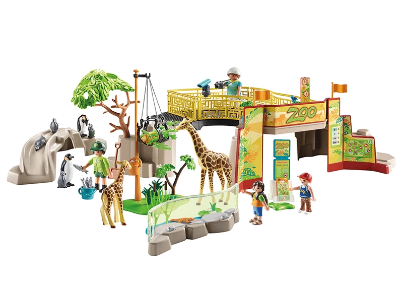 Entra en el alegre zoo de aventuras de PLAYMOBIL. Aquí se pueden observar de cerca animales exóticos. La pasarela sobre el portal de entrada conduce a los visitantes a su recorrido de observación. Desde esta posición elevada, los pingüinos y las jirafas se pueden ver tranquilamente en sus amplios recintos. Es la hora de alimentar a los animales y el cuidador del zoo proporciona a las jirafas comida y agua fresca. Luego coge la pala y limpia el recinto. Mientras tanto, los pingüinos se deslizan alegremente por el tobogán de hielo hacia el agua. Un set de juego diseñado con mucho cariño para los pequeños amigos de los animales. El set incluye dos figuras PLAYMOBIL, dos figuras infantiles, una jirafa con su cría, dos pingüinos, cuatro crías de pingüino, dos ratones, una lagartija, un pájaro, una puerta de entrada con camino de observación, varios elementos de delimitación y otros estupendos extras. Con la ayuda de los elementos de delimitación incluidos, los recintos de los animales se pueden diseñar de forma flexible. Combine este set con el (71192) Leones con recinto exterior para obtener aún más diversión.