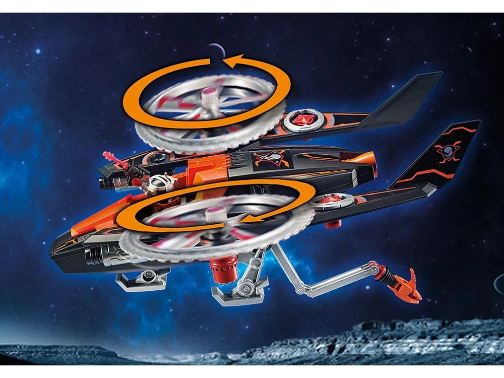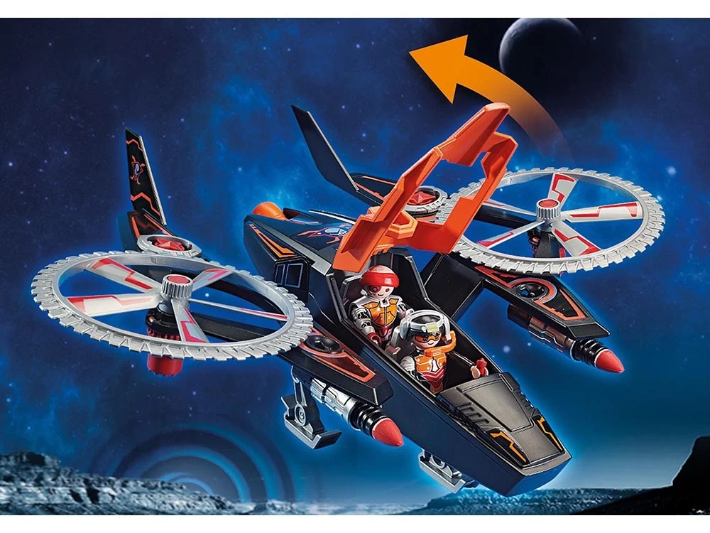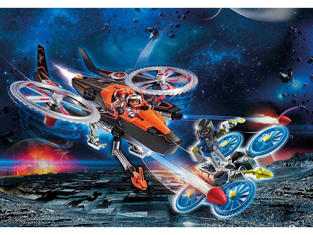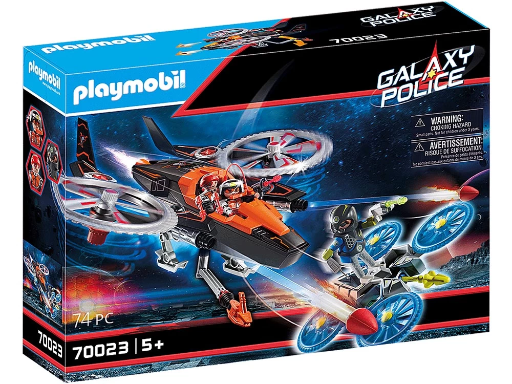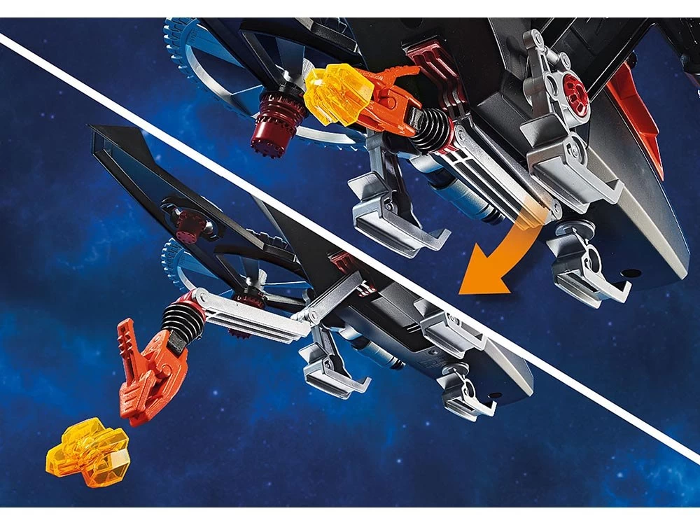 Con dos lanzacohetes, rotores rotativos de ataque y dispositivos de navegación extraíbles. La caja fuerte (Art. 70022) se puede robar con el brazo de agarre. Incl. Dron Galaxy Police para emocionantes persecuciones.