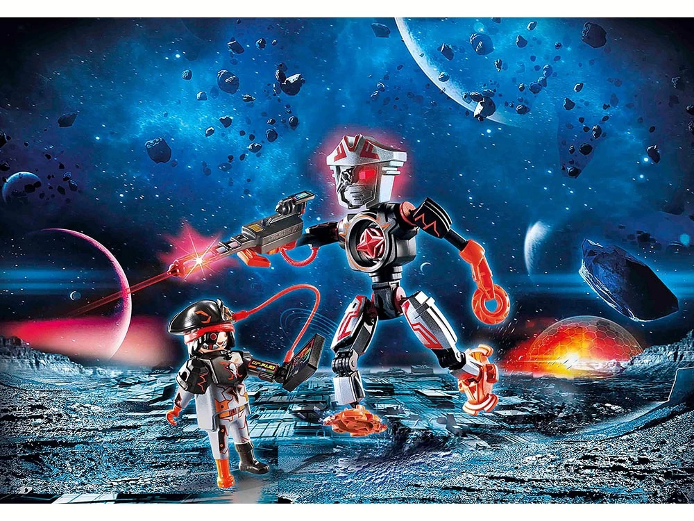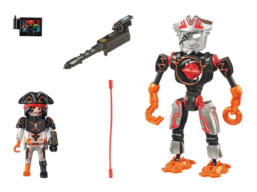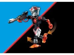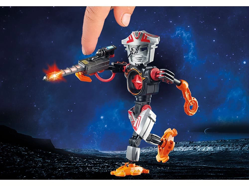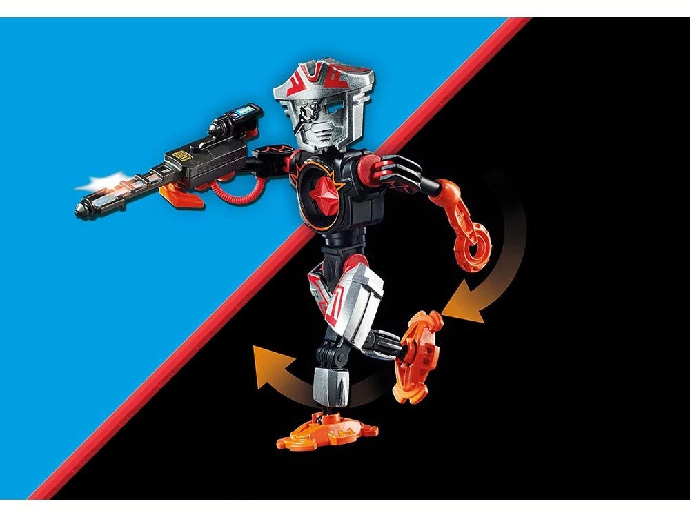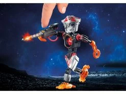 Robot de combate extremadamente ágil con agarre y brazo de sierra circular. Arma láser con función de luz intermitente (pilas incluidas). En el cuerpo del robot hay una brújula extraíble.
