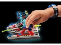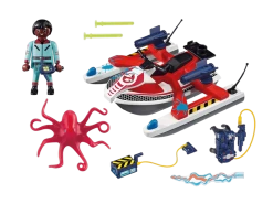 Con moto de agua que flota. El pulpo cambia de color cuando cambia la temperatura del agua. Se le puede adaptar motor submarino. Incluye figura de Zeddemore. Un juguete basado en la serie de dibujos los Verdaderos Cazafantasmas.
