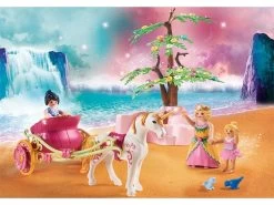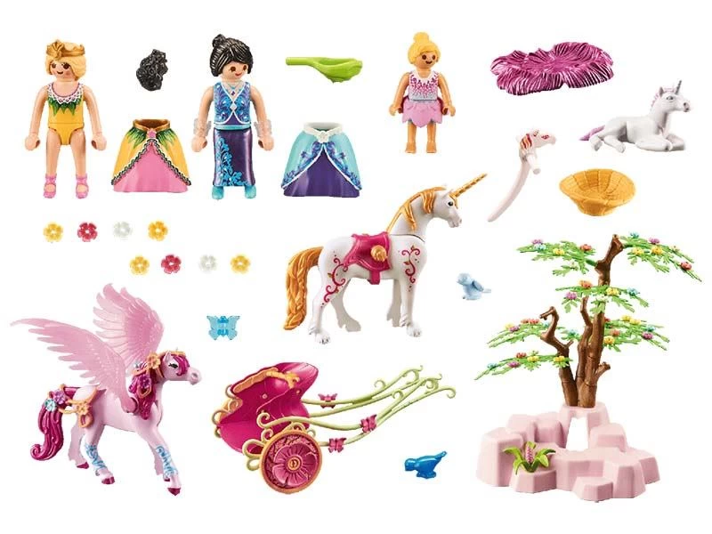 Emoción en el castillo PLAYMOBIL: las princesas acaban de enterarse de que hay un misterioso Pegaso en un cercano bosque encantado. Para saludar a la misteriosa criatura, las 3 princesas parten en su carroza Unicornio PLAYMOBIL hacia el árbol mágico. El gran unicornio se coloca delante del carruaje de juguete y comienza el mágico paseo. Cuando las tres princesas PLAYMOBIL ven al impresionante Pegaso PLAYMOBIL con sus grandes alas, ¡la hermosa criatura las deja sin palabras! Pocas veces han visto un animal tan bonito: Guirnaldas decorativas y flores de colores adornan el Pegaso.