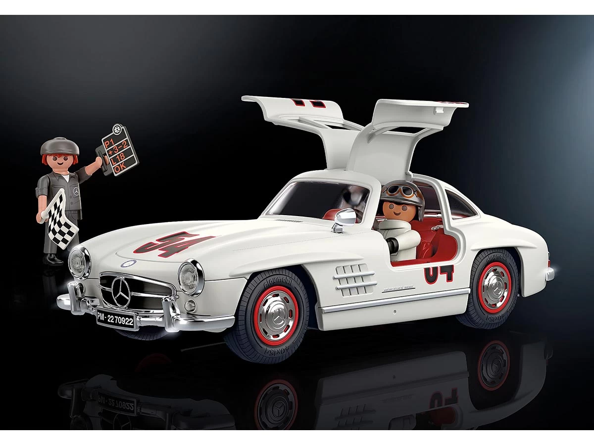 El icono de los coches deportivos de los años 50 con las legendarias puertas de ala de gaviota. Ahora también de PLAYMOBIL, equipado con figuras y accesorios en un escenario de carreras de los años 50.