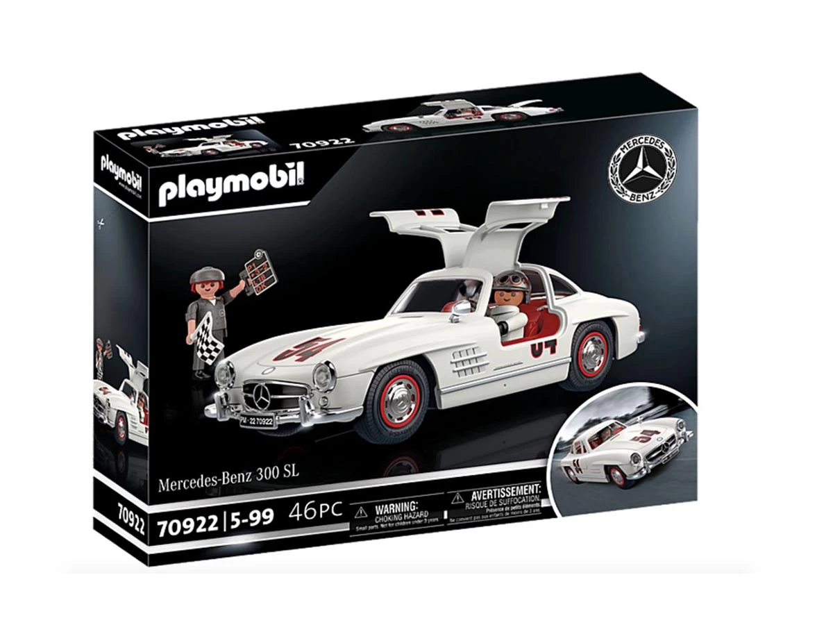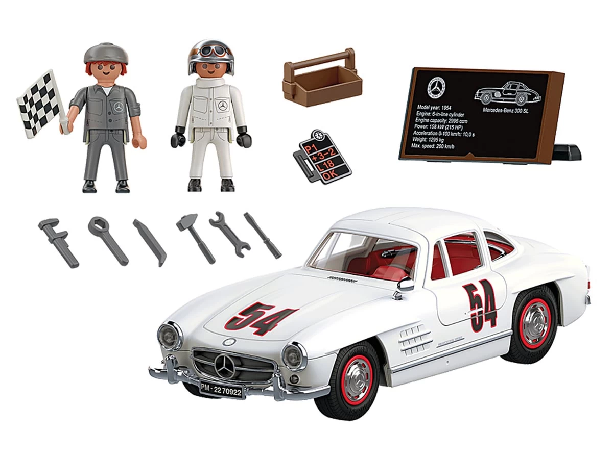 El Mercedes-Benz 300 SL de PLAYMOBIL: un ícono de automóvil deportivo que no debería faltar en ninguna colección de automóviles. El juego incluye un piloto de carreras, un mecánico, una caja de herramientas, una bandera de línea de meta, un tablero de boxes y muchos otros accesorios para una carrera divertida. La placa de mesa incluida enumera la información más importante del automóvil deportivo. Recomendado para edades de cinco a noventa y nueve años. Advertencia. Peligro de asfixia. Pequeñas partes. No para niños menores de 3 años.