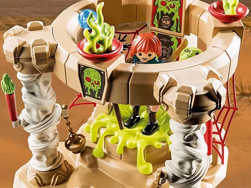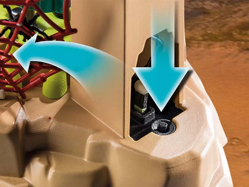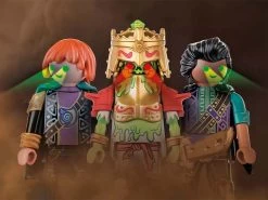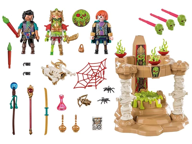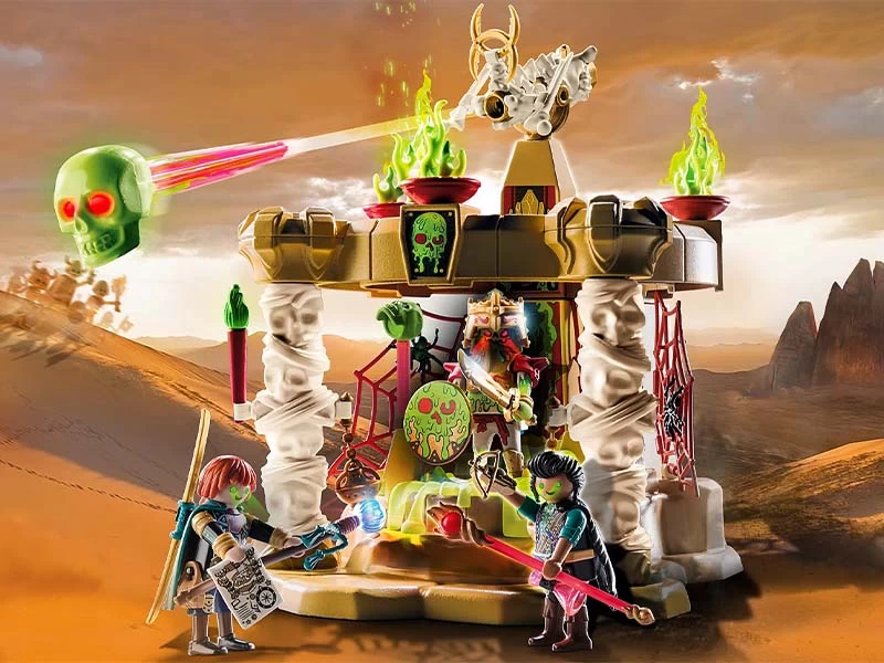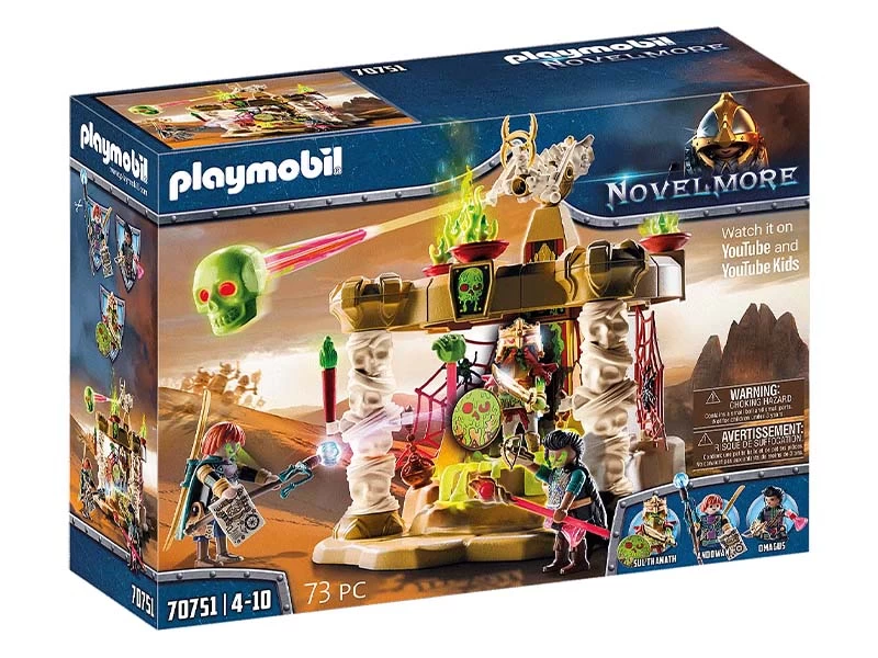 El reluciente templo de Sal’ahari Sands es lo que los espeluznantes guerreros esqueléticos llaman hogar. Es aquí donde el ejército de no muertos, liderado por el temible Skeleton King Sul’thanath, planea su próximo movimiento contra Novelmore. Como no muertos, no temen a nada ni a nadie. Si alguien se atreve a acercarse al templo, es recibido con balas de calavera del cañón de los esqueletos. Antes de cada batalla, los no muertos reponen su energía. Para ello, se colocan en el manantial mágico que hay en el centro del templo y esperan a que les cargue por completo y sus ojos empiecen a brillar. No se debe jugar con estos siniestros guerreros del desierto. El set de juego contiene el Skeleton King Sul’thanath, así como los dos aprendices de brujo Omagus y Andowan, un templo con módulo de luz, cañón esquelético, telas de araña, antorchas y muchos otros extras. La cabeza de las figuras está equipada con un dispositivo de almacenamiento de energía que puede cargarse mediante la bobina de inducción del templo, lo que hace que los ojos de las figuras brillen.
