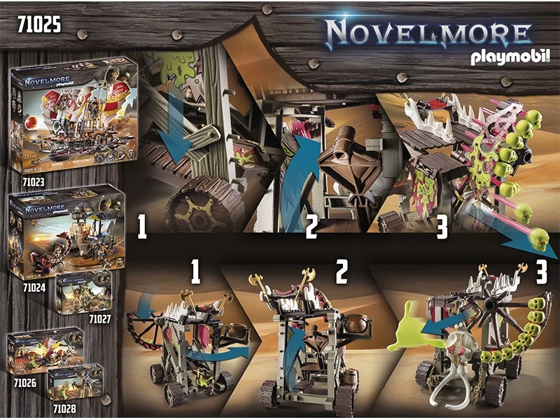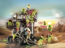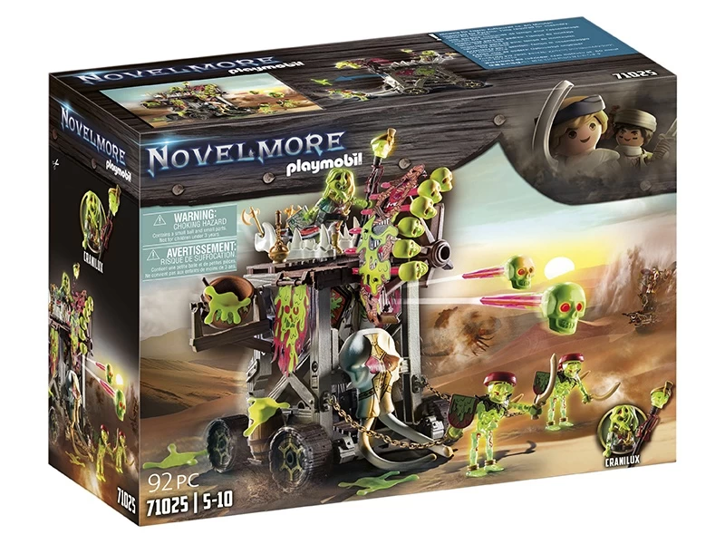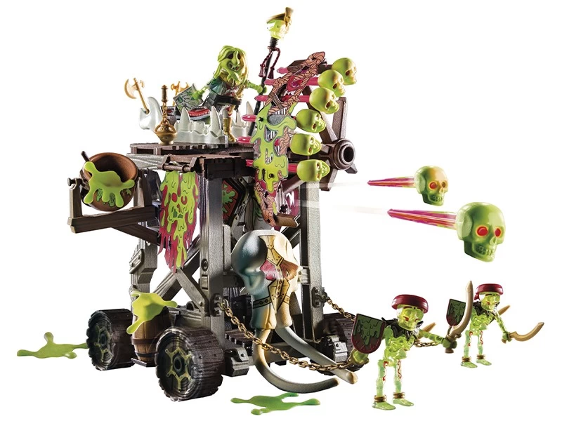 En su torre de ataque, el Ejército de Esqueletos procesa una sustancia para sus peligrosos proyectiles. Además, el Trono del Trueno está protegido por una batería de calaveras que puede disparar proyectiles de calaveras a los enemigos a la velocidad del rayo. La torre con ruedas es tirada por dos espeluznantes esqueletos. Un emocionante set de juego de PLAYMOBIL con muchas funciones para vivir emocionantes aventuras de juego. Para una mayor diversión de juego, la torre de ataque se puede combinar con el set 71027 Arenas de Sal’ahari – Mamut de Mor’Ghul.